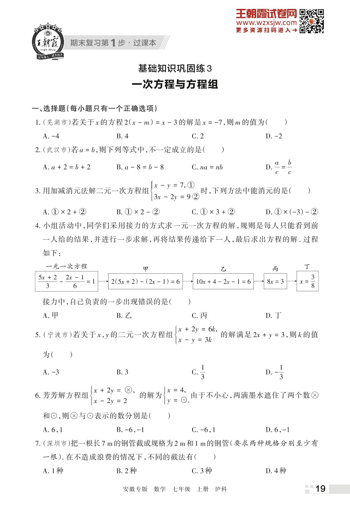 王朝霞期末过课本——基础知识巩固练3 一次方程与方程组七年级上册数学(沪科版)