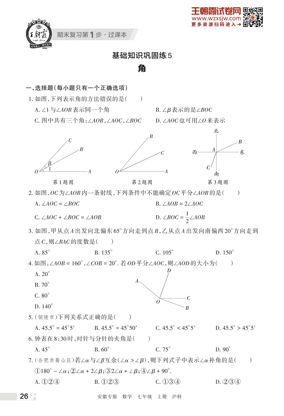 王朝霞期末过课本——基础知识巩固练5 角七年级上册数学(沪科版)