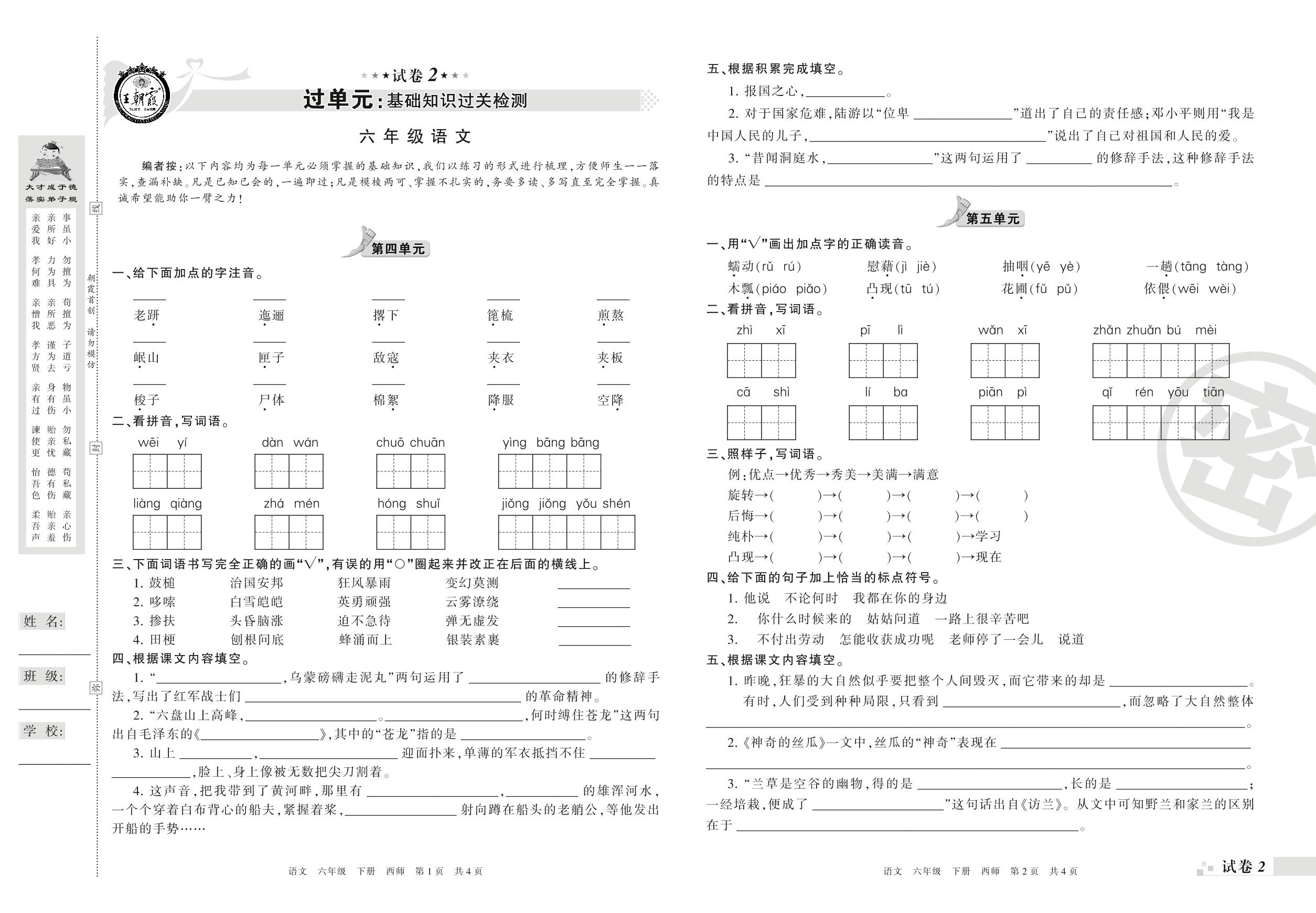 王朝霞期末过单元——基础知识过关检测六年级下册语文(西师版)【2】