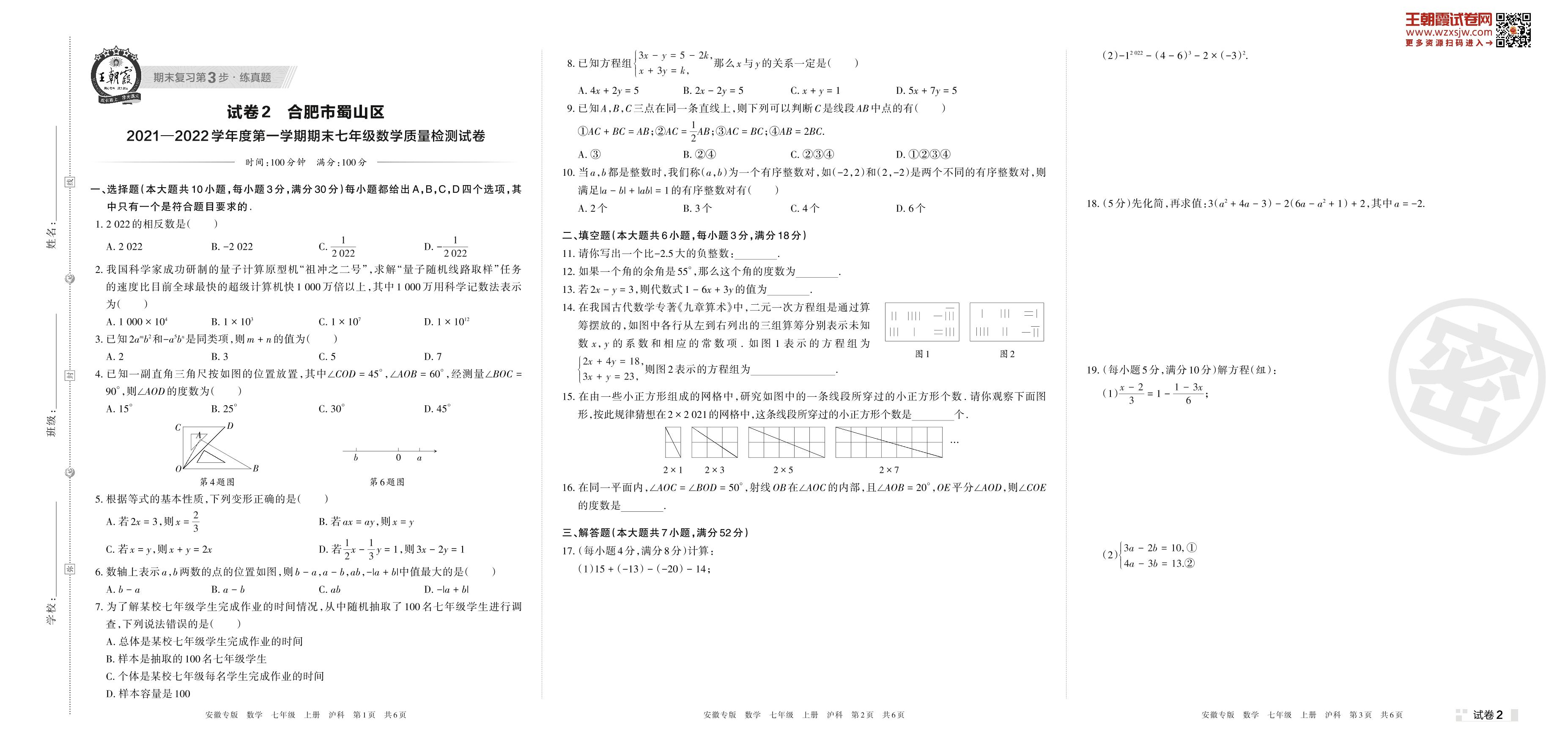 合肥市蜀山区2021—2022学年度第一学期期末七年级数学质量检测试卷(沪科版)【2】
