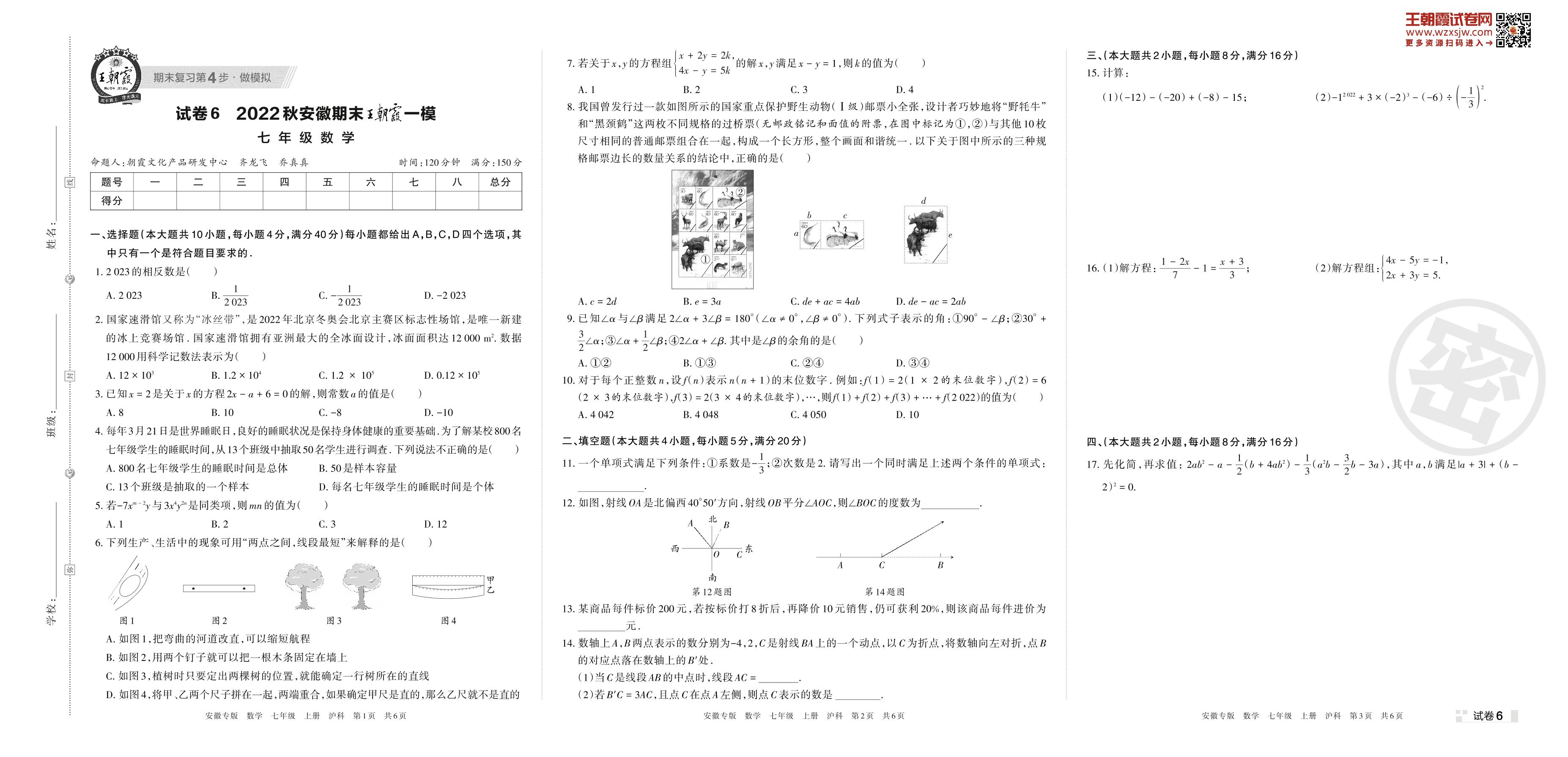 王朝霞期末模拟卷七年级上册数学(沪科版)_R221123233014695【6】