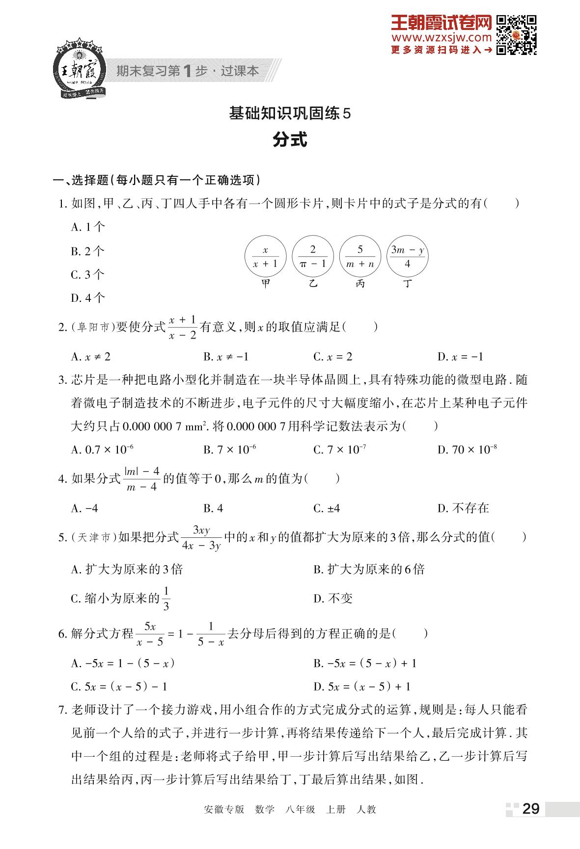 王朝霞期末过课本——基础知识巩固练5 分式八年级上册数学(人教版)