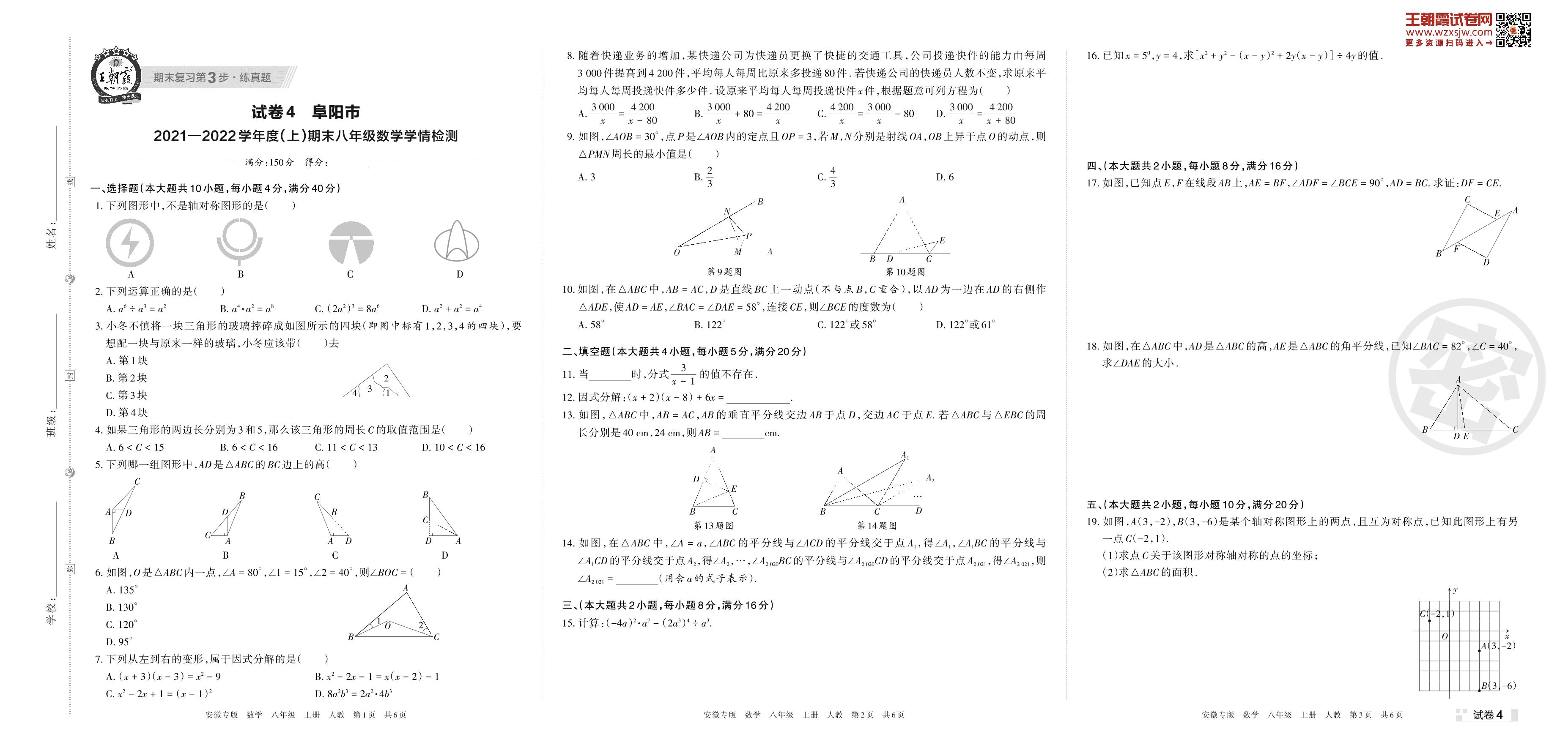 阜阳市2021一2022学年度(上)期末八年级数学学情检测(人教版)【4】