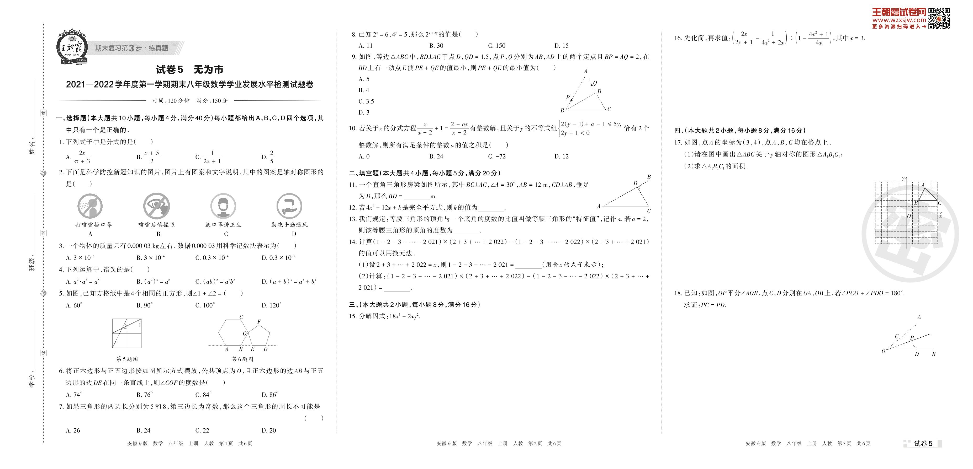 无为市2021-2022学年度第一学期期末八年级数学学业发展水平检测试题卷(人教版)【5】