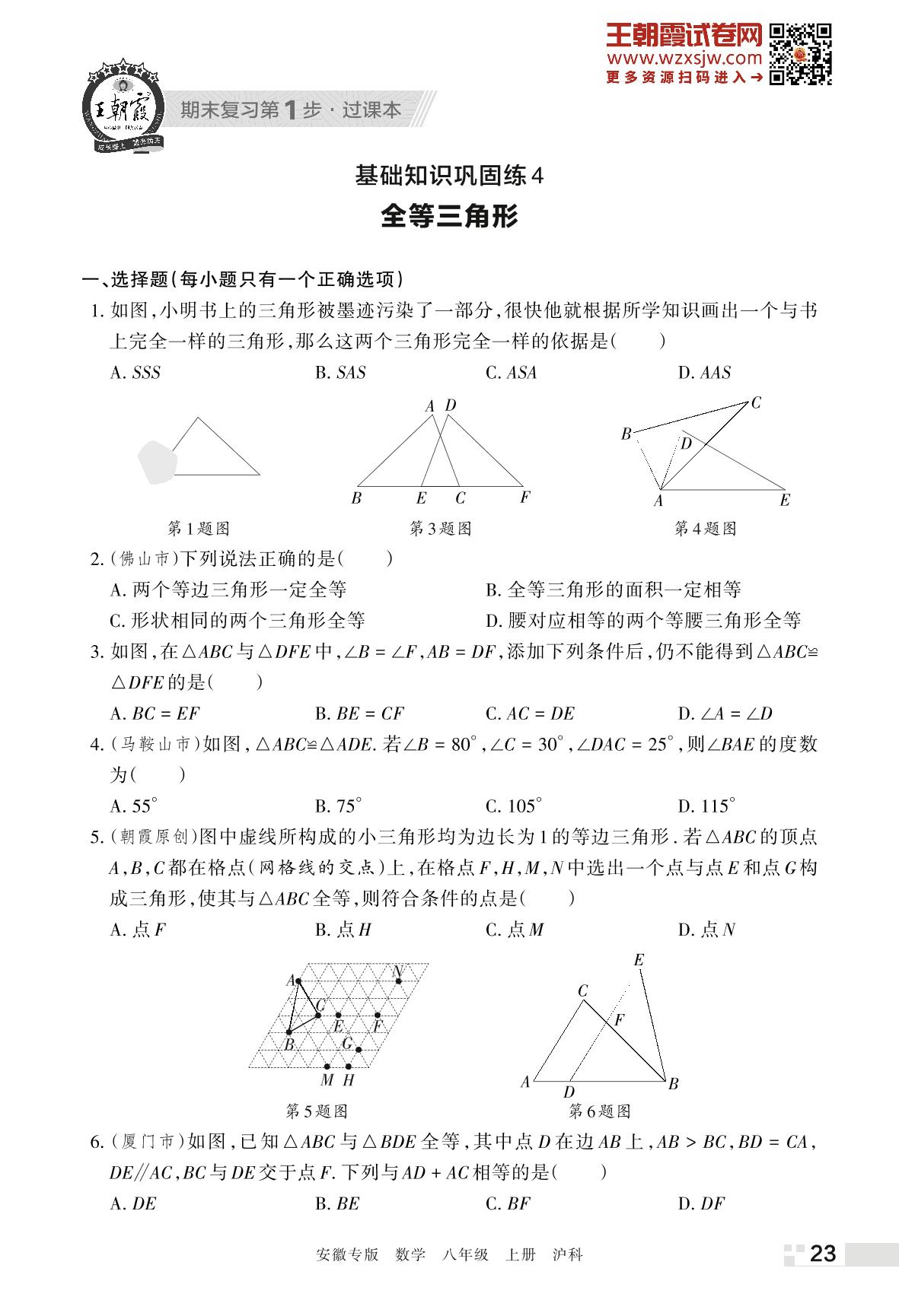 王朝霞期末过课本——基础知识巩固练4 全等三角形八年级上册数学(沪科版)