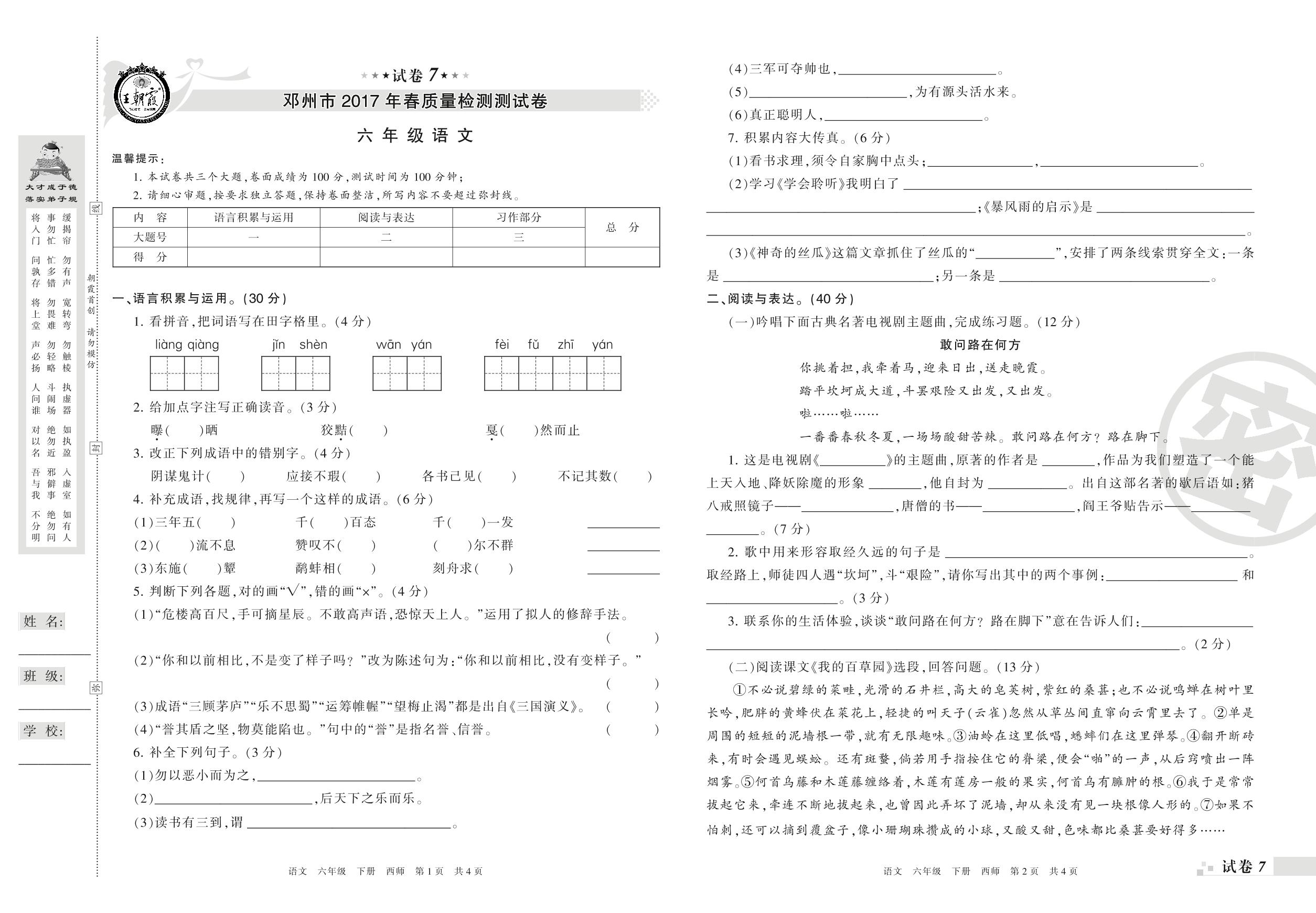 2016-2017学年第二学期邓州市六年级语文试卷(西师版)【7】