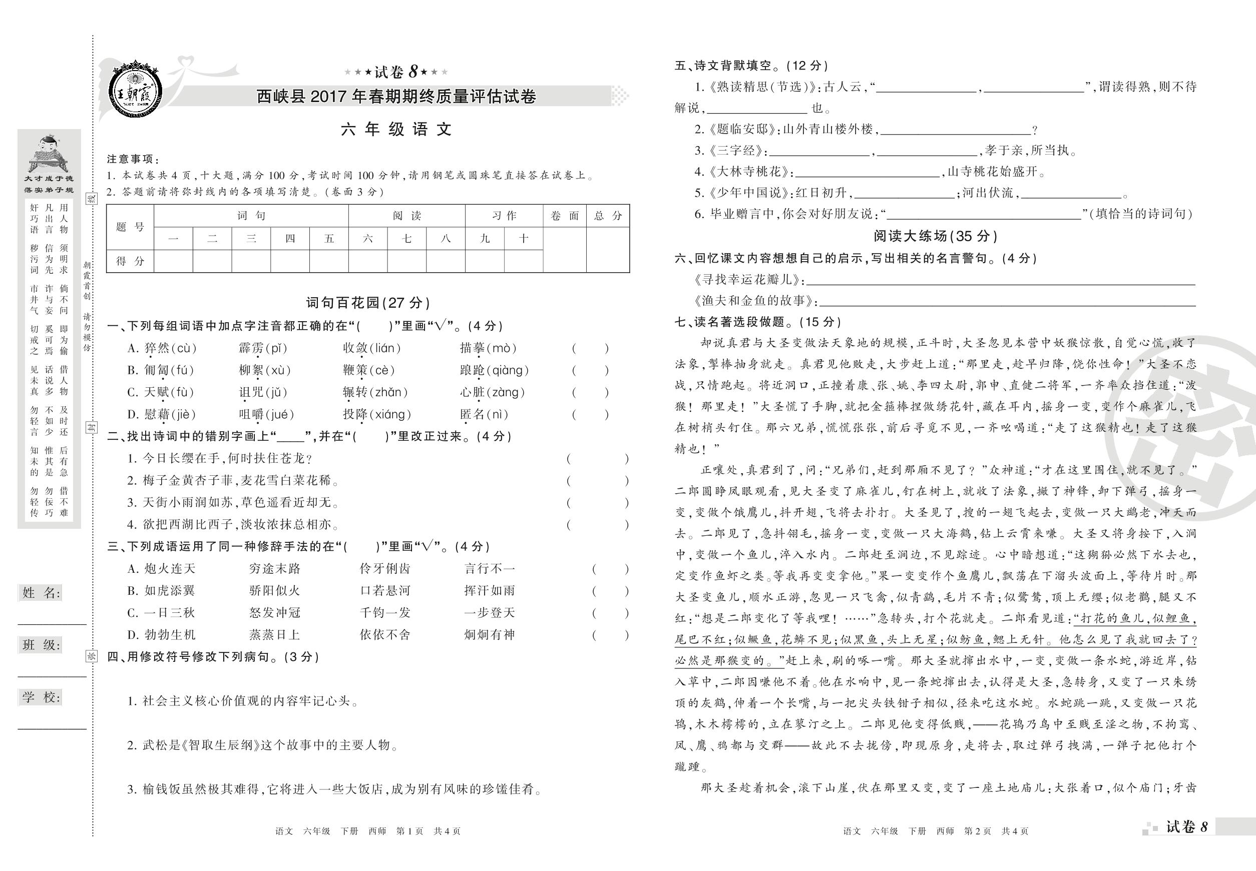 2016-2017学年第二学期南阳市西峡县六年级语文试卷(西师版)【8】