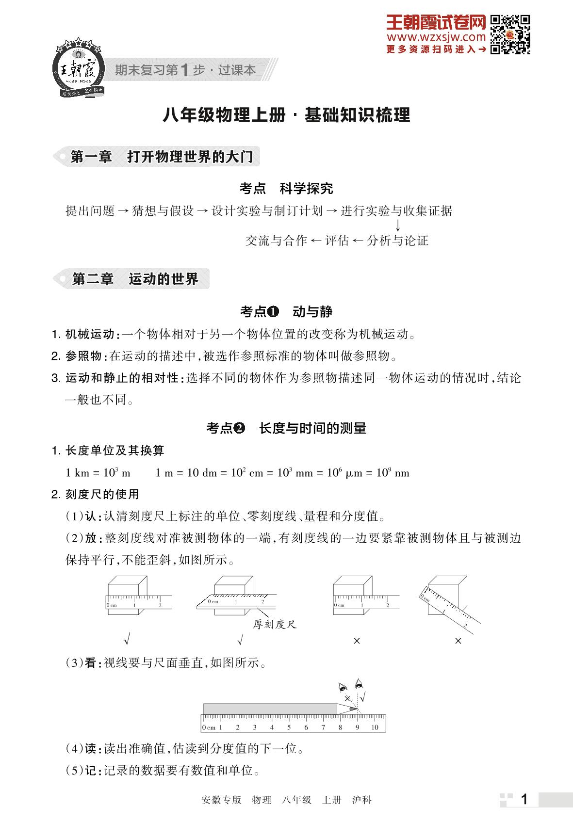 王朝霞期末知识梳理——第二章 运动的世界八年级上册物理(沪科版)