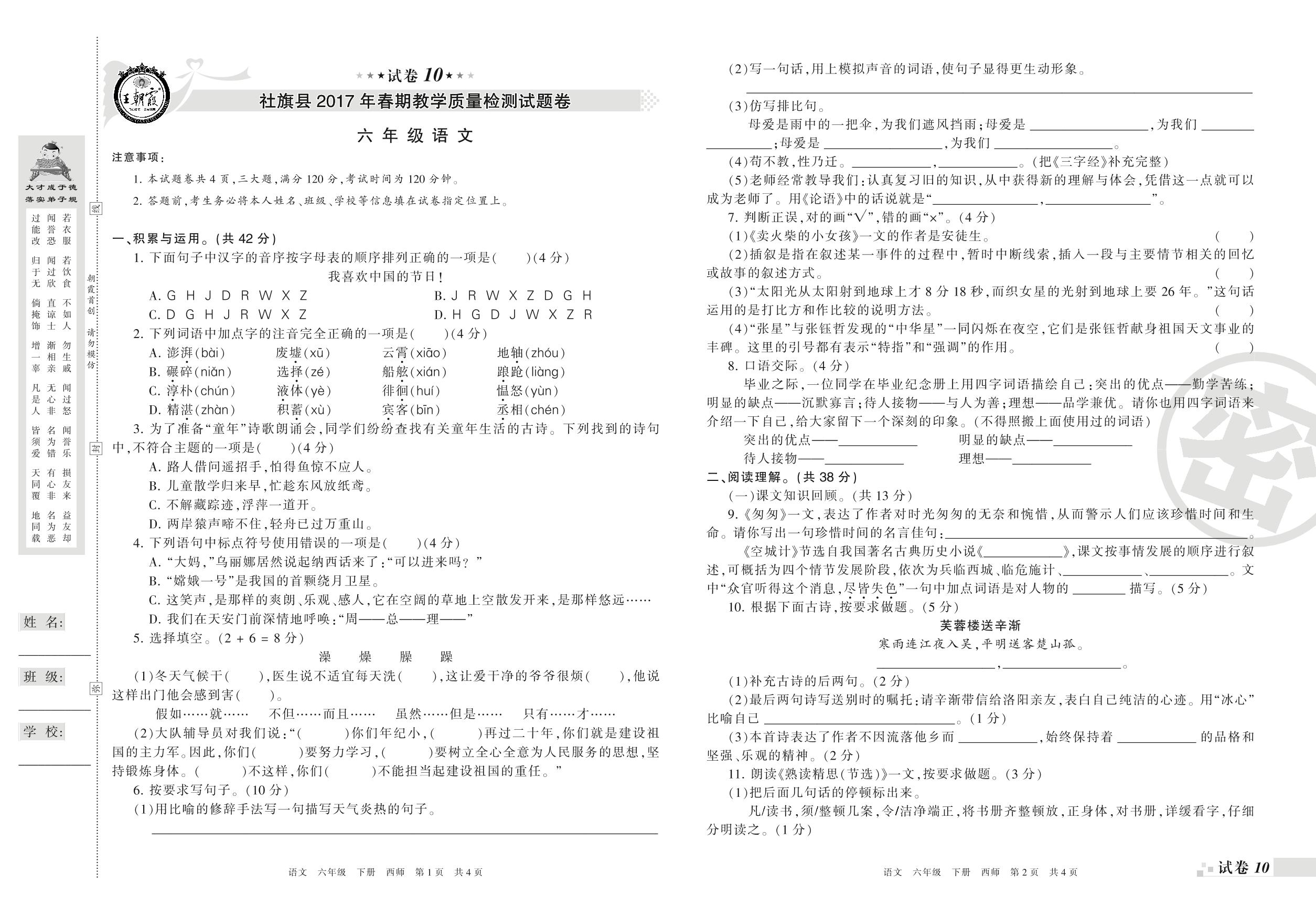 2016-2017学年第二学期南阳市社旗县六年级语文试卷(西师版)【10】
