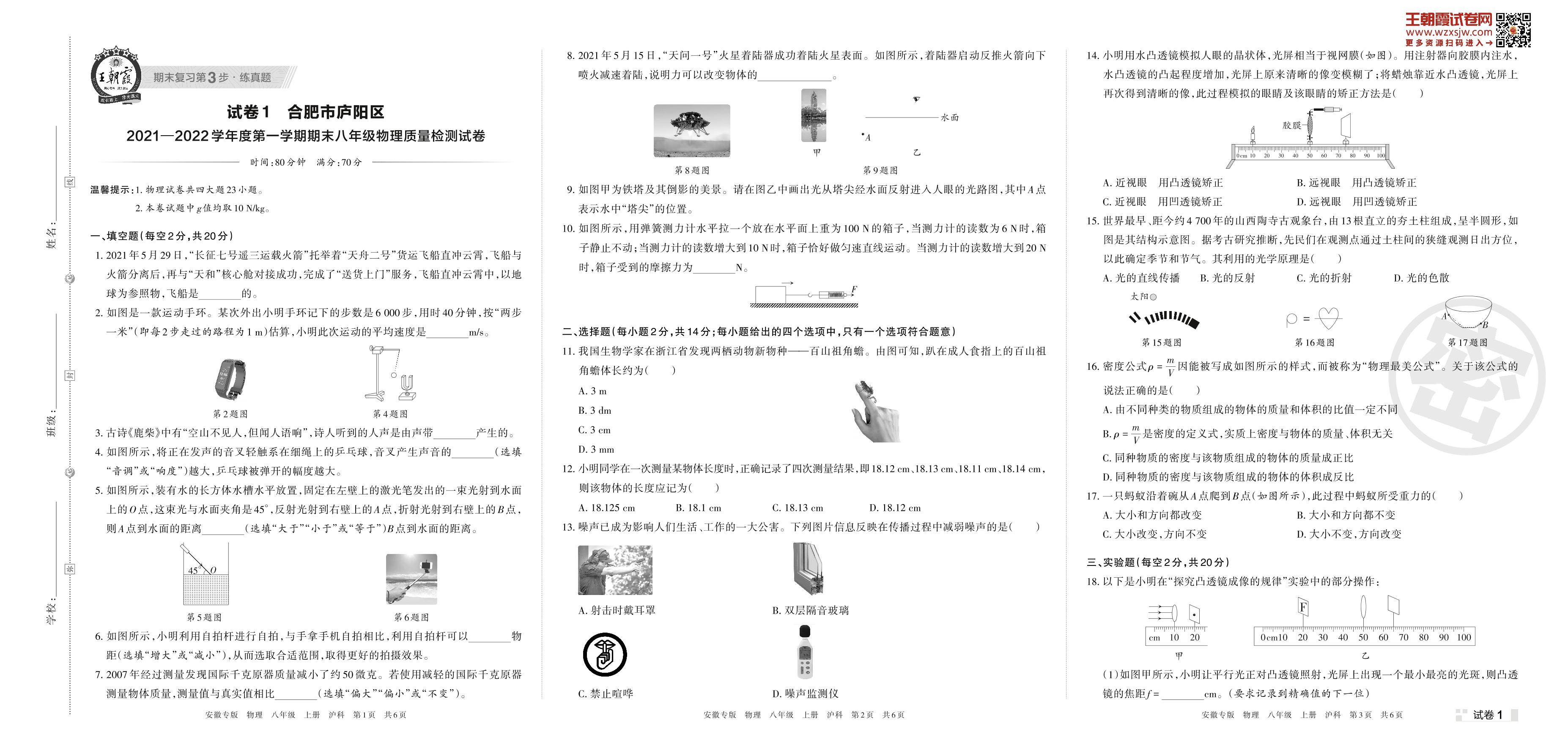 合肥市庐阳区2021—2022学年度第一学期期末八年级物理质量检测试卷(沪科版)【1】