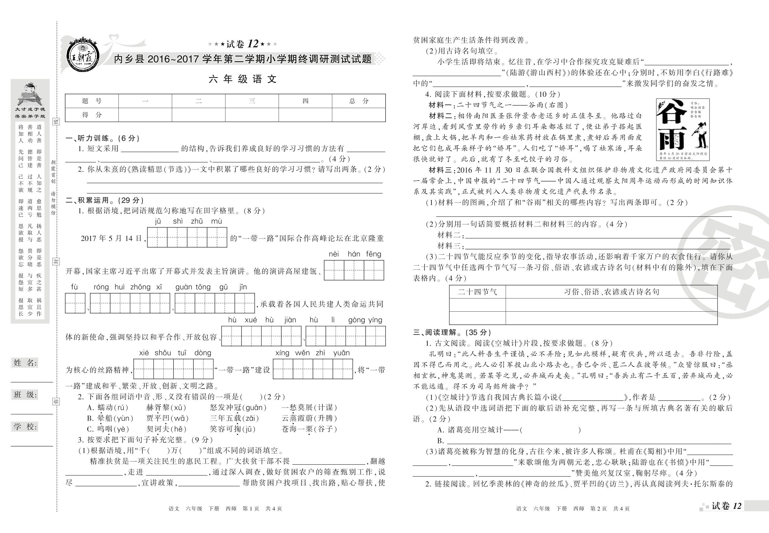 2016-2017学年第二学期南阳市内乡县六年级语文试卷(西师版)【12】