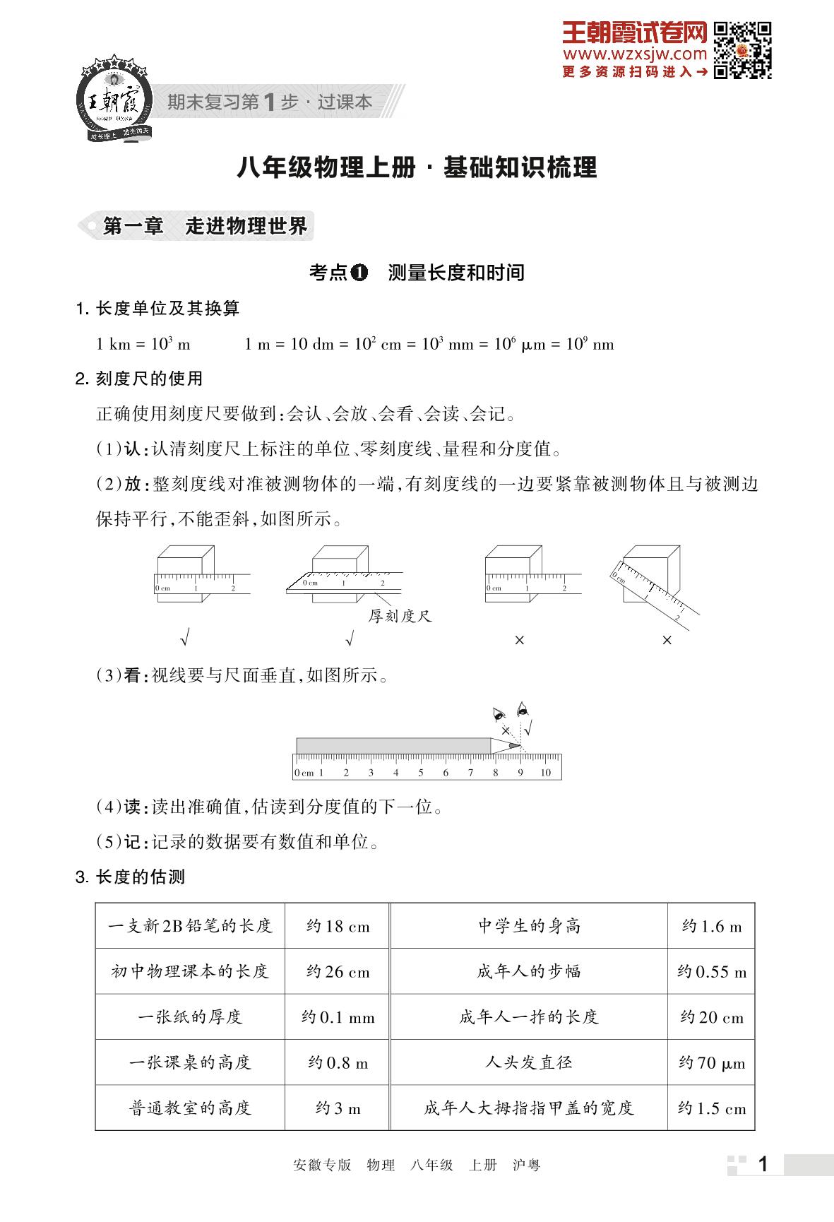 王朝霞期末知识梳理——第一章 走进物理世界八年级上册物理(沪粤版)