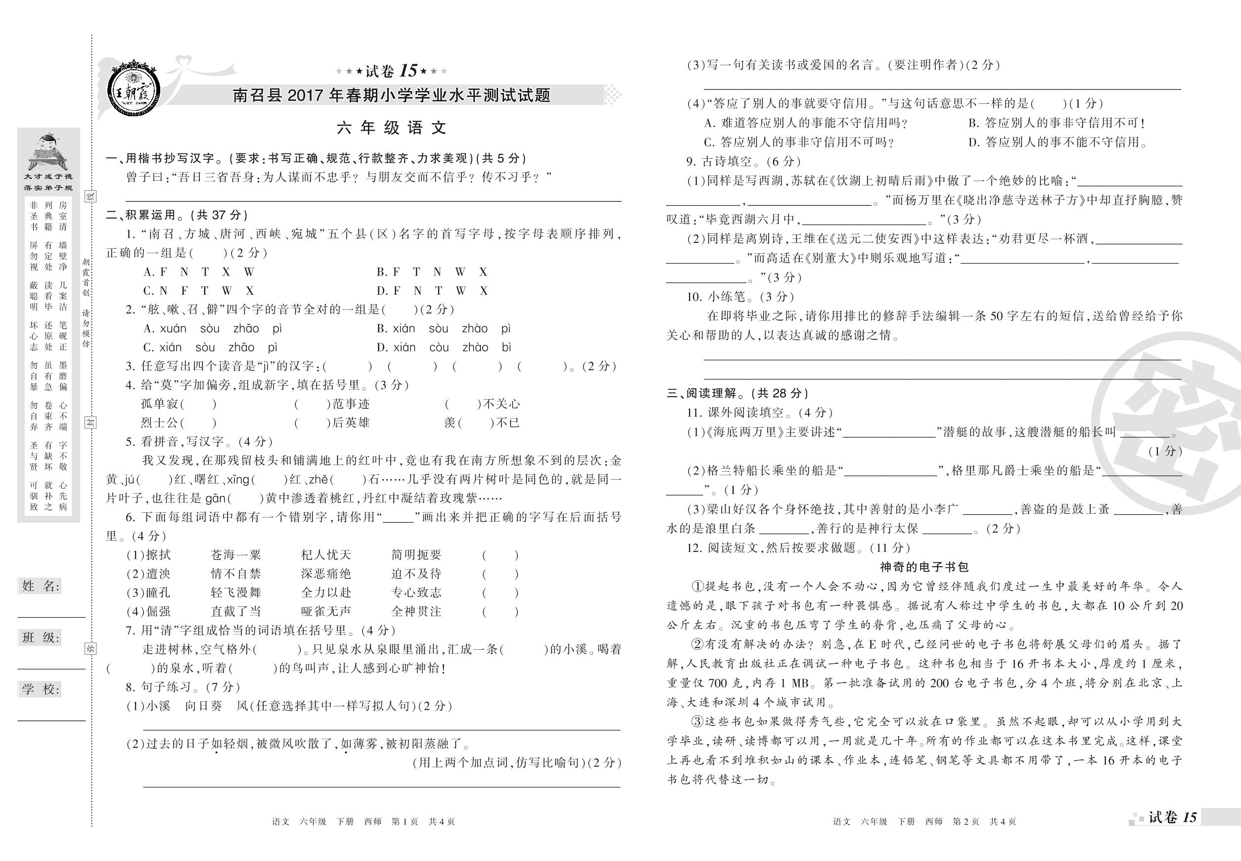 2016-2017学年第二学期南阳市南召县六年级语文试卷(西师版)【15】