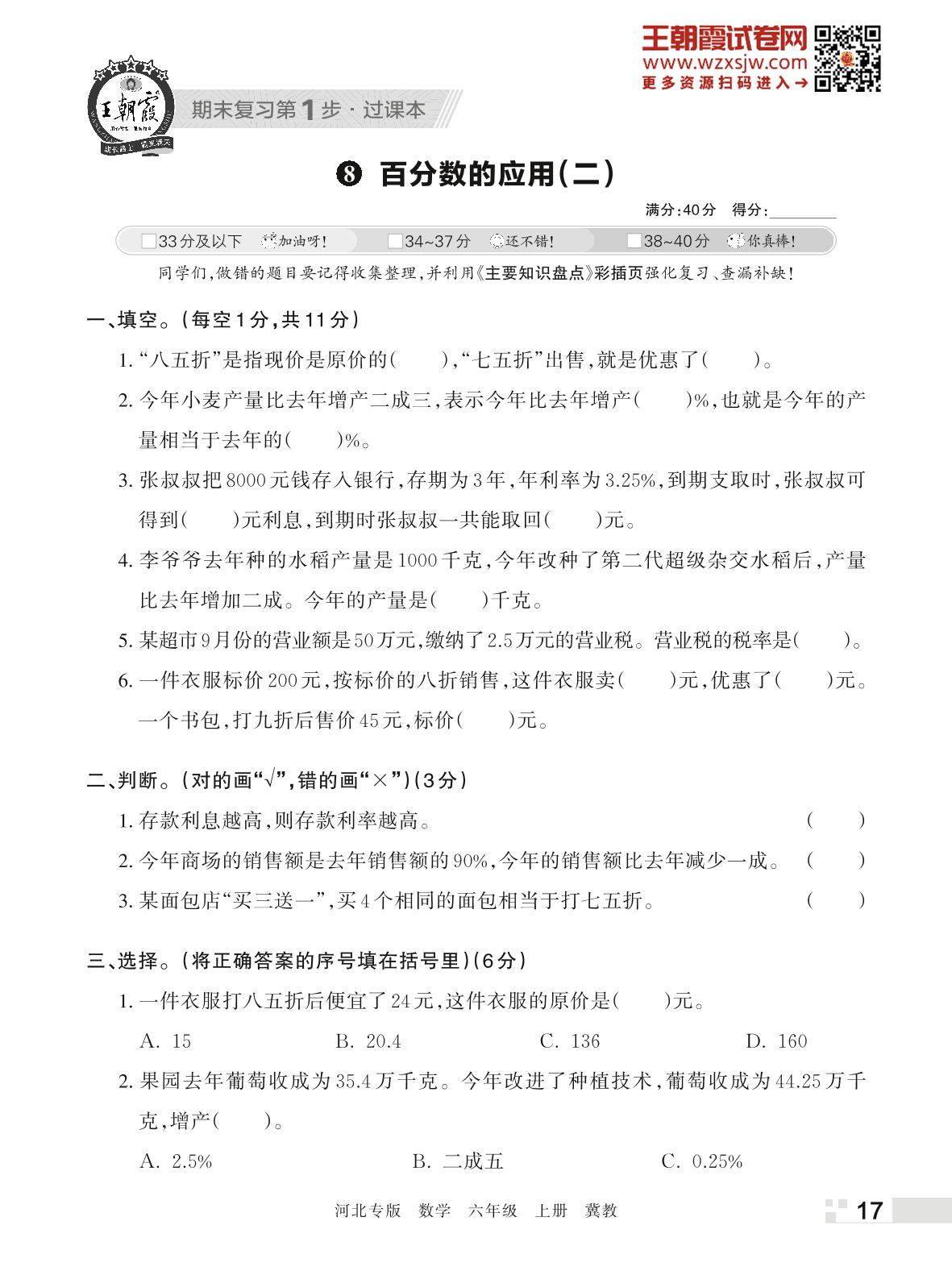王朝霞期末过课本——8 百分数的应用(二)六年级上册数学(冀教版)