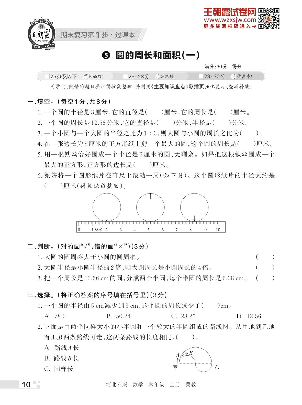 王朝霞期末过课本——5 圆的周长和面积(一)六年级上册数学(冀教版)