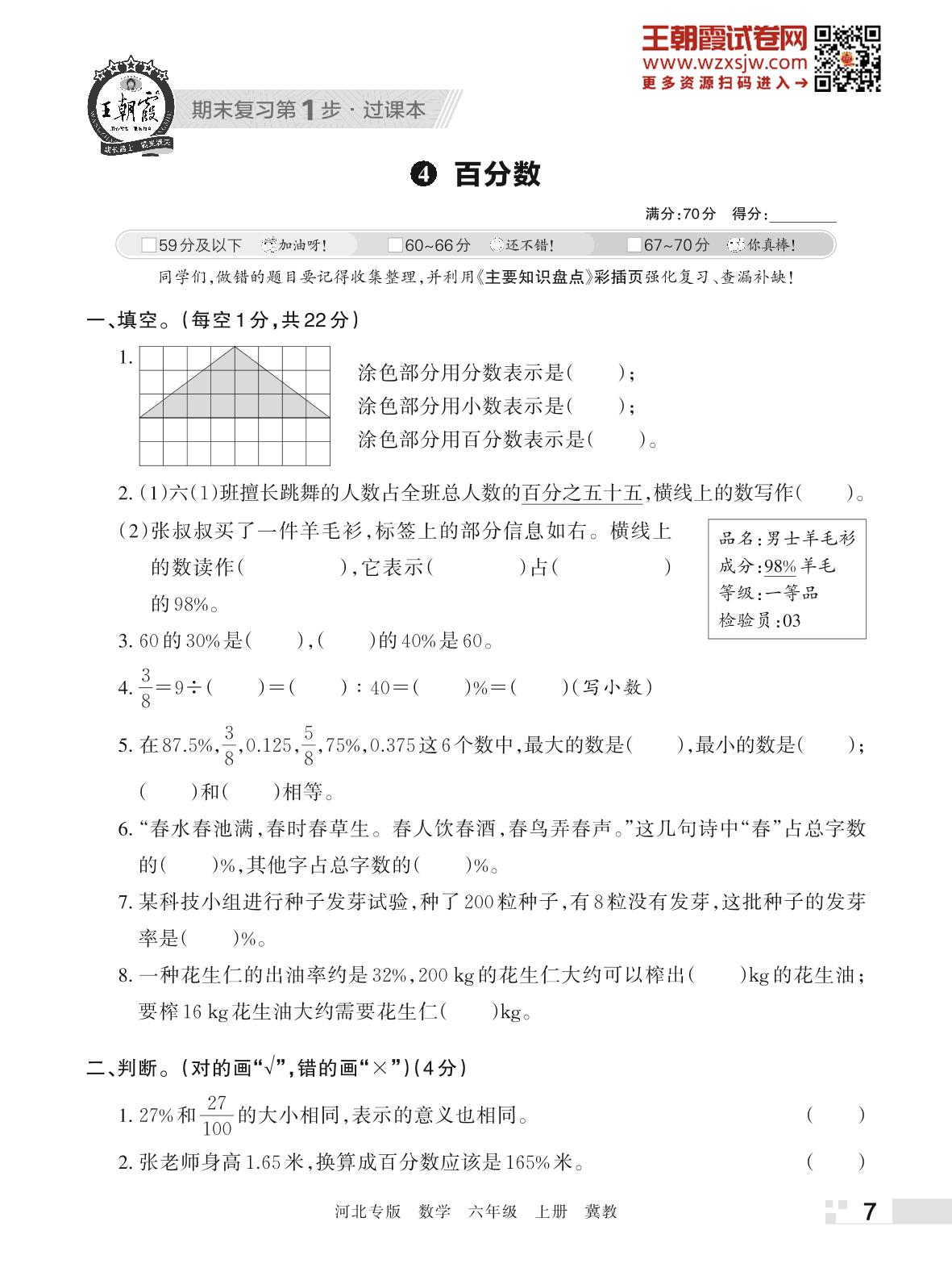 王朝霞期末过课本——4 百分数六年级上册数学(冀教版)