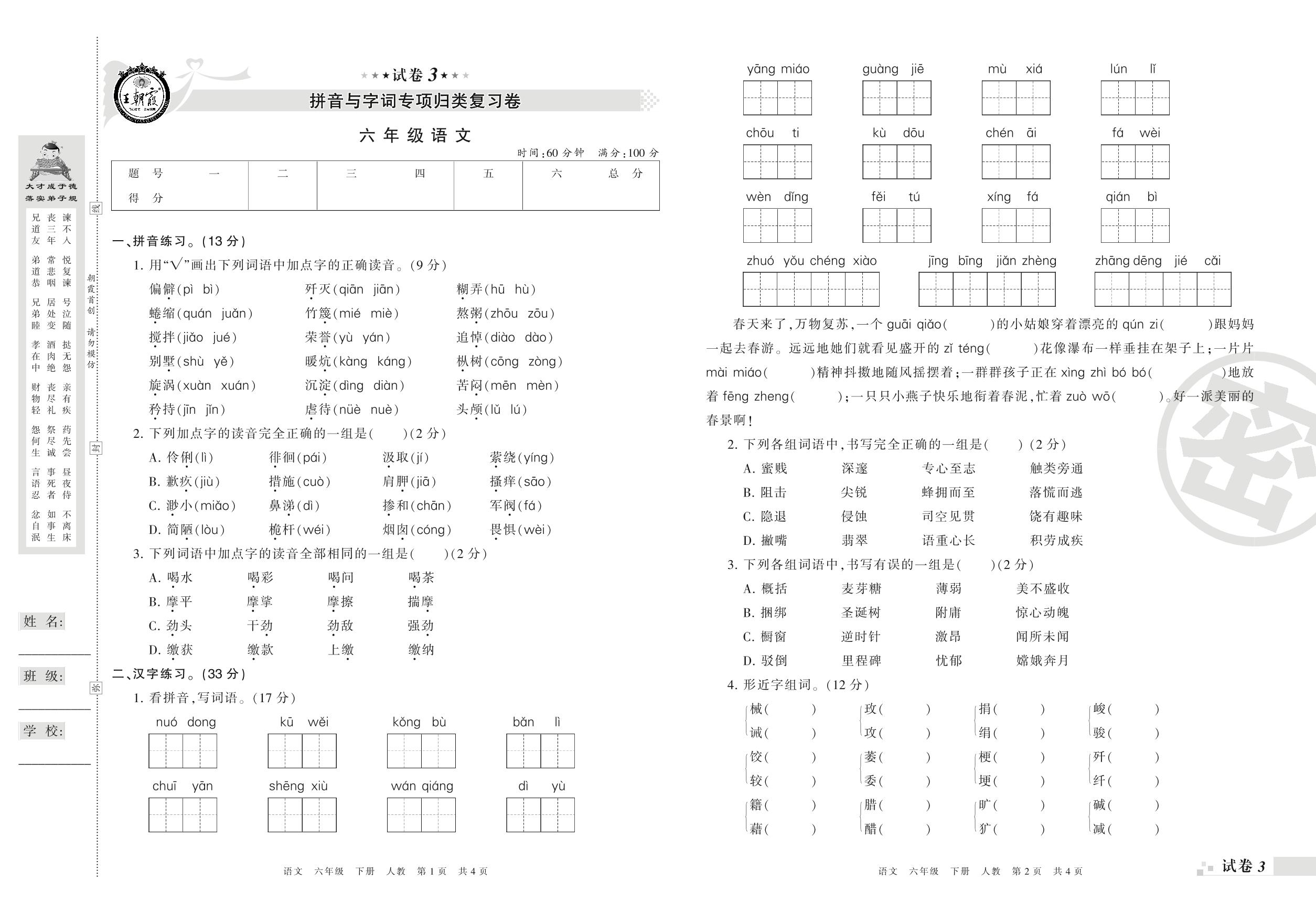 王朝霞期末专项卷——拼音与字词专项归类复习卷六年级下册语文(人教版)_R210802115957【3】