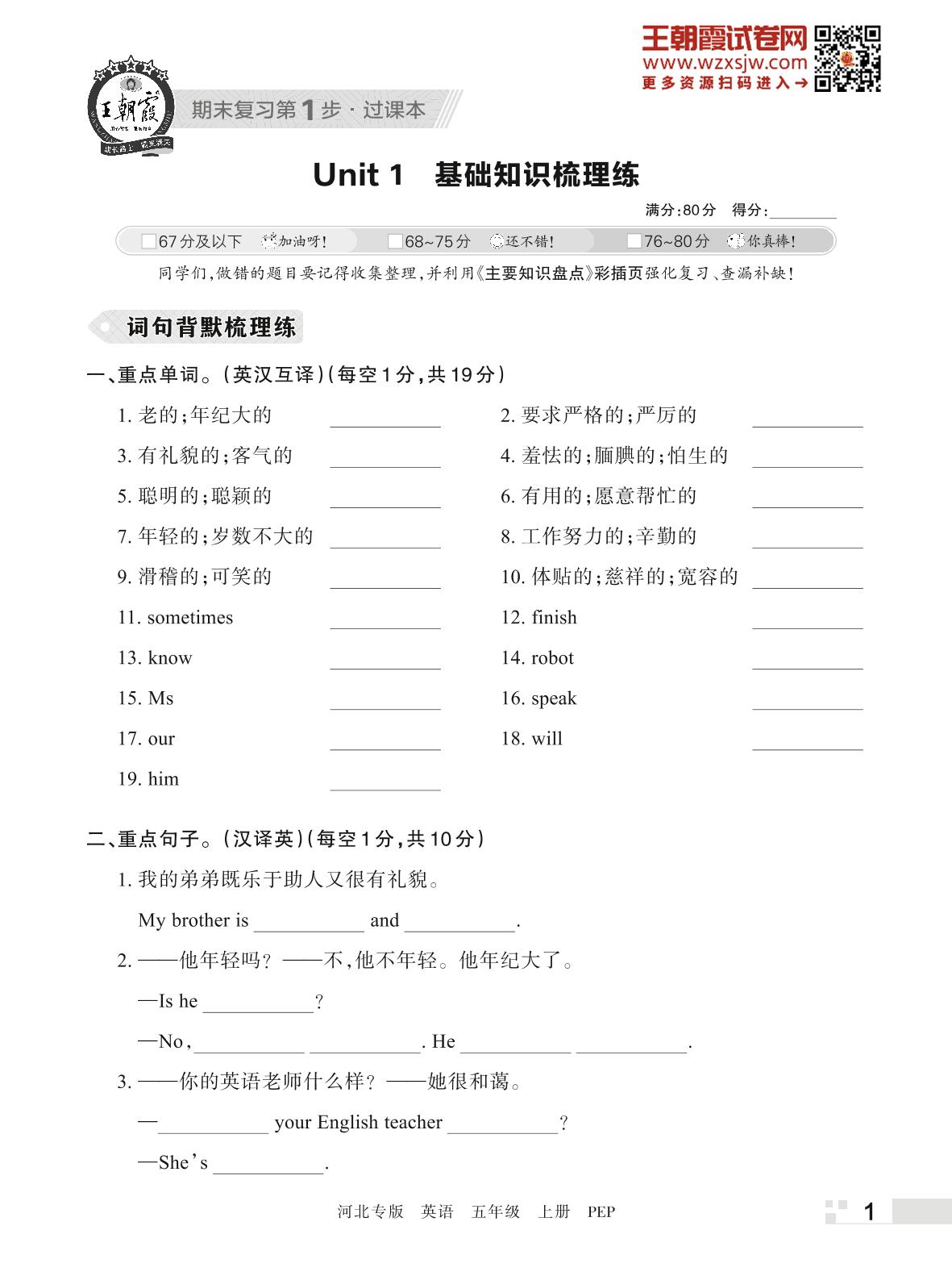 王朝霞期末过课本——Unit 1 基础知识梳理练五年级上册英语(PEP版)_R221124104942745