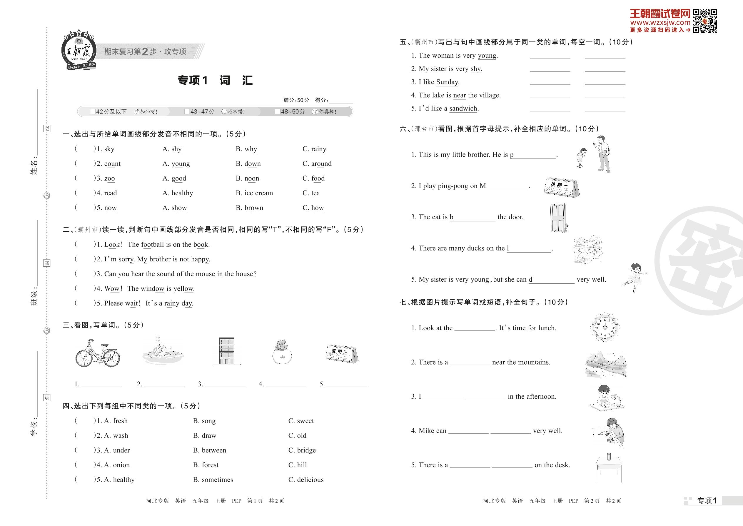 王朝霞期末专项卷——词汇五年级上册英语(PEP版)_R221124104944547【1】