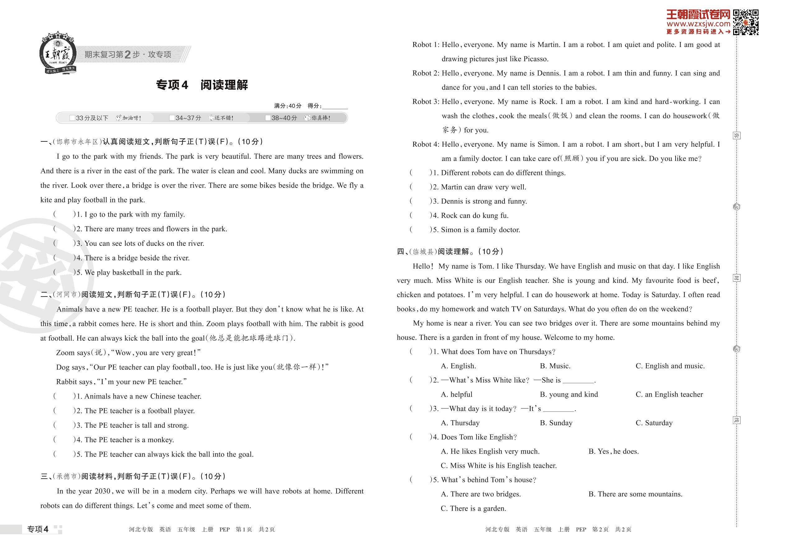 王朝霞期末专项卷——阅读理解五年级上册英语(PEP版)_R221124104944572【4】
