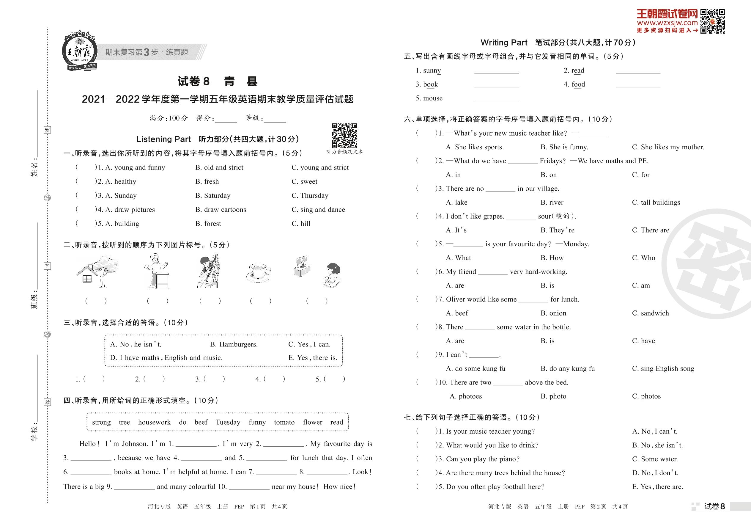 青县2021—2022学年度第一学期五年级英语期末教学质量评估试题(PEP版)【8】