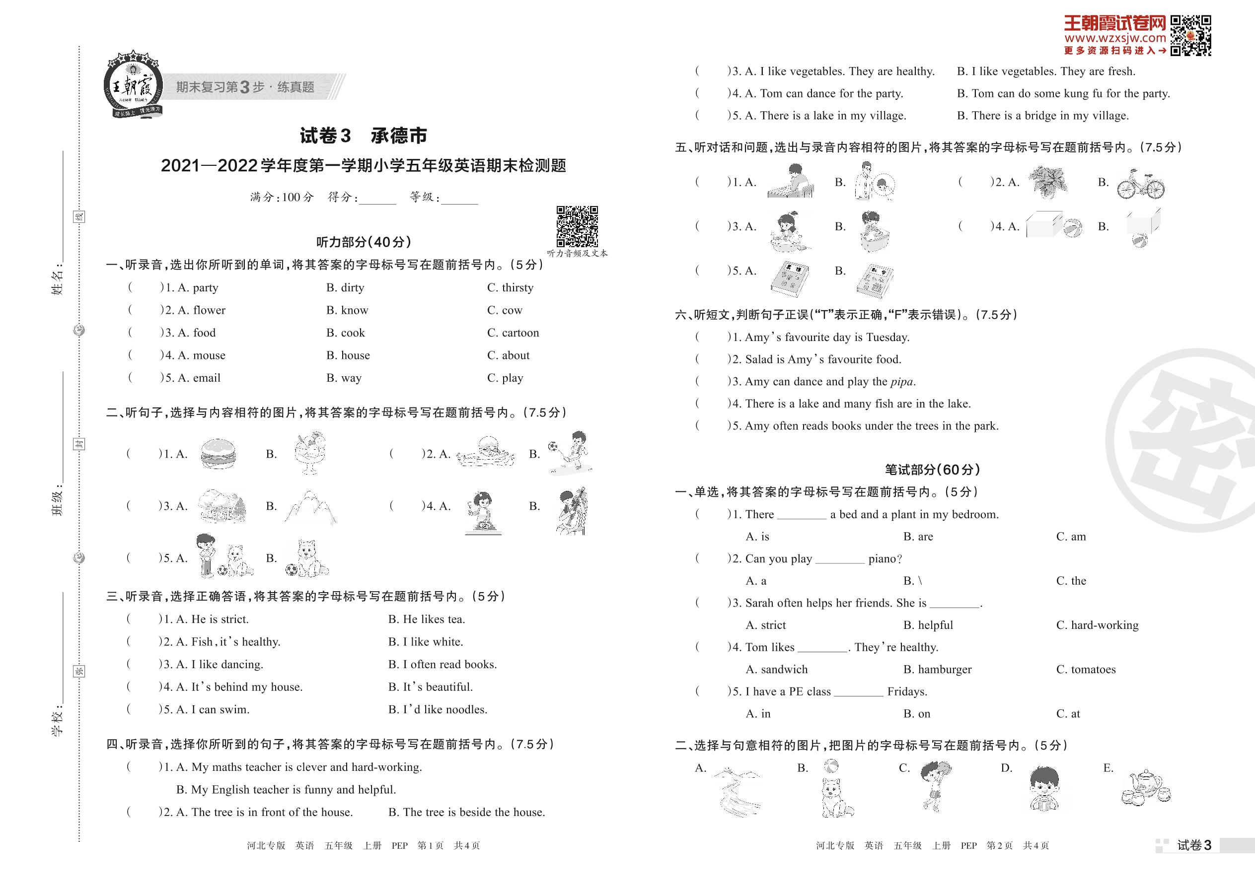承德市2021—2022学年度第一学期小学五年级英语期末检测题(PEP版)【3】
