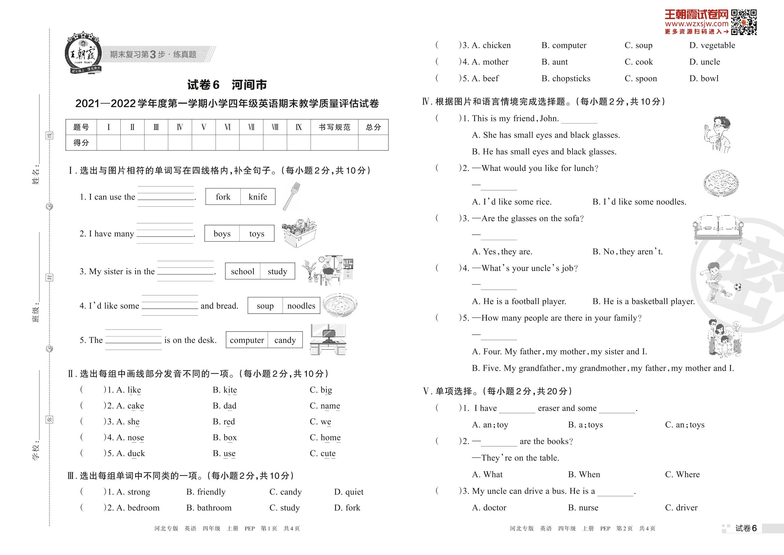 河间市2021—2022学年度第一学期小学四年级英语期末教学质量评估试卷(PEP版)【6】