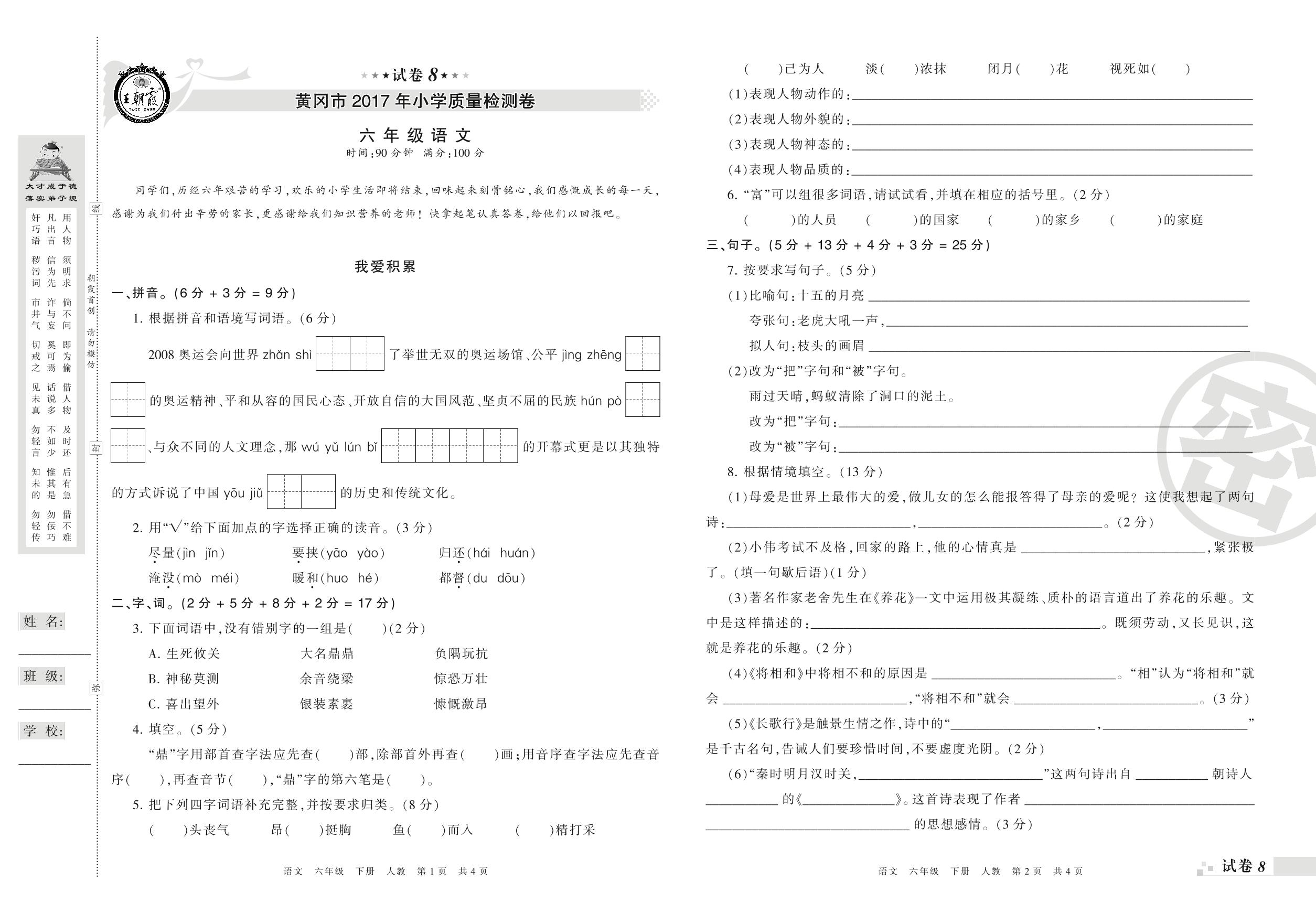 2016-2017学年第二学期黄冈市六年级语文试卷(人教版)【8】
