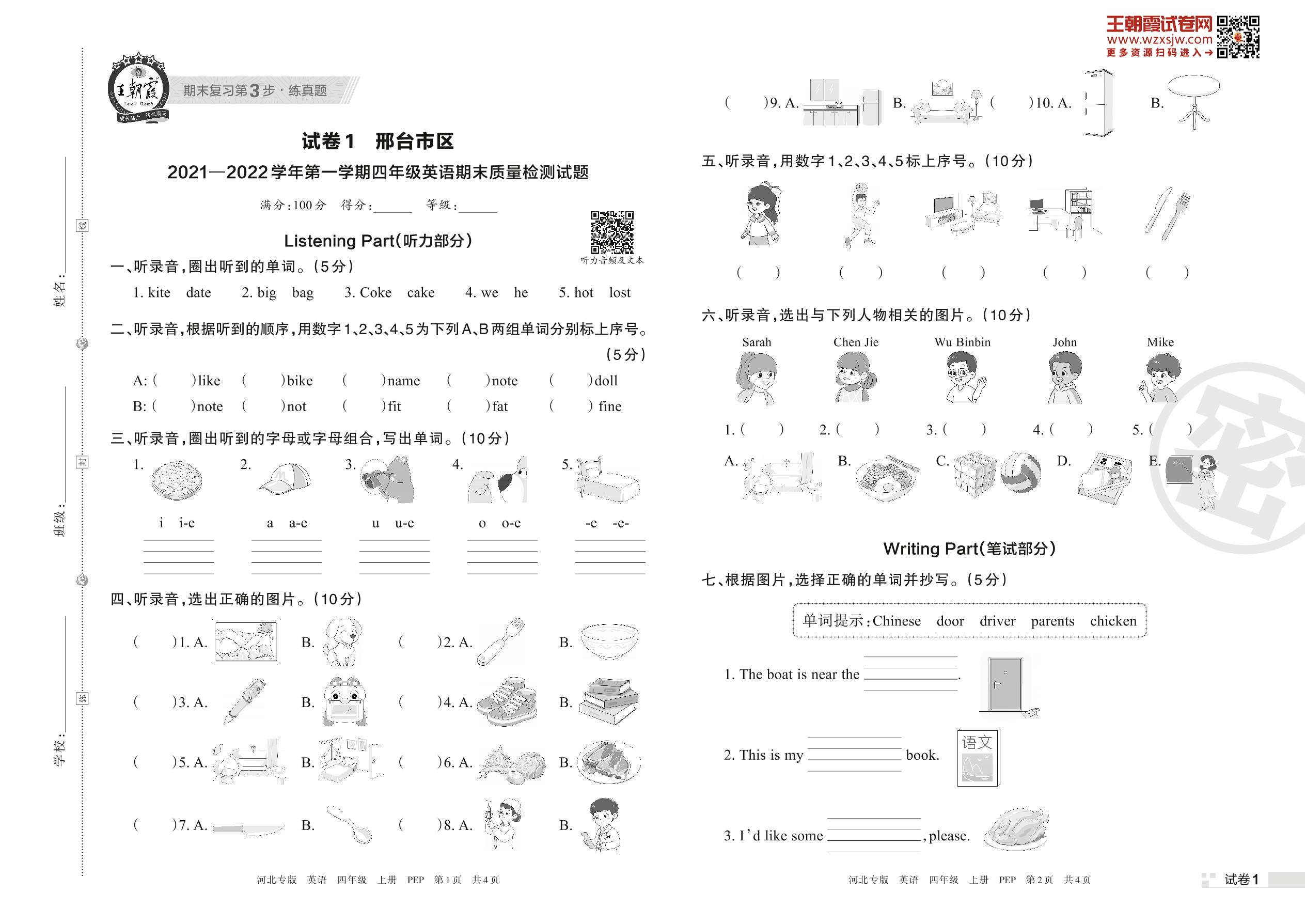 邢台市区2021—2022学年第一学期四年级英语期末质量检测试题(PEP版)【1】