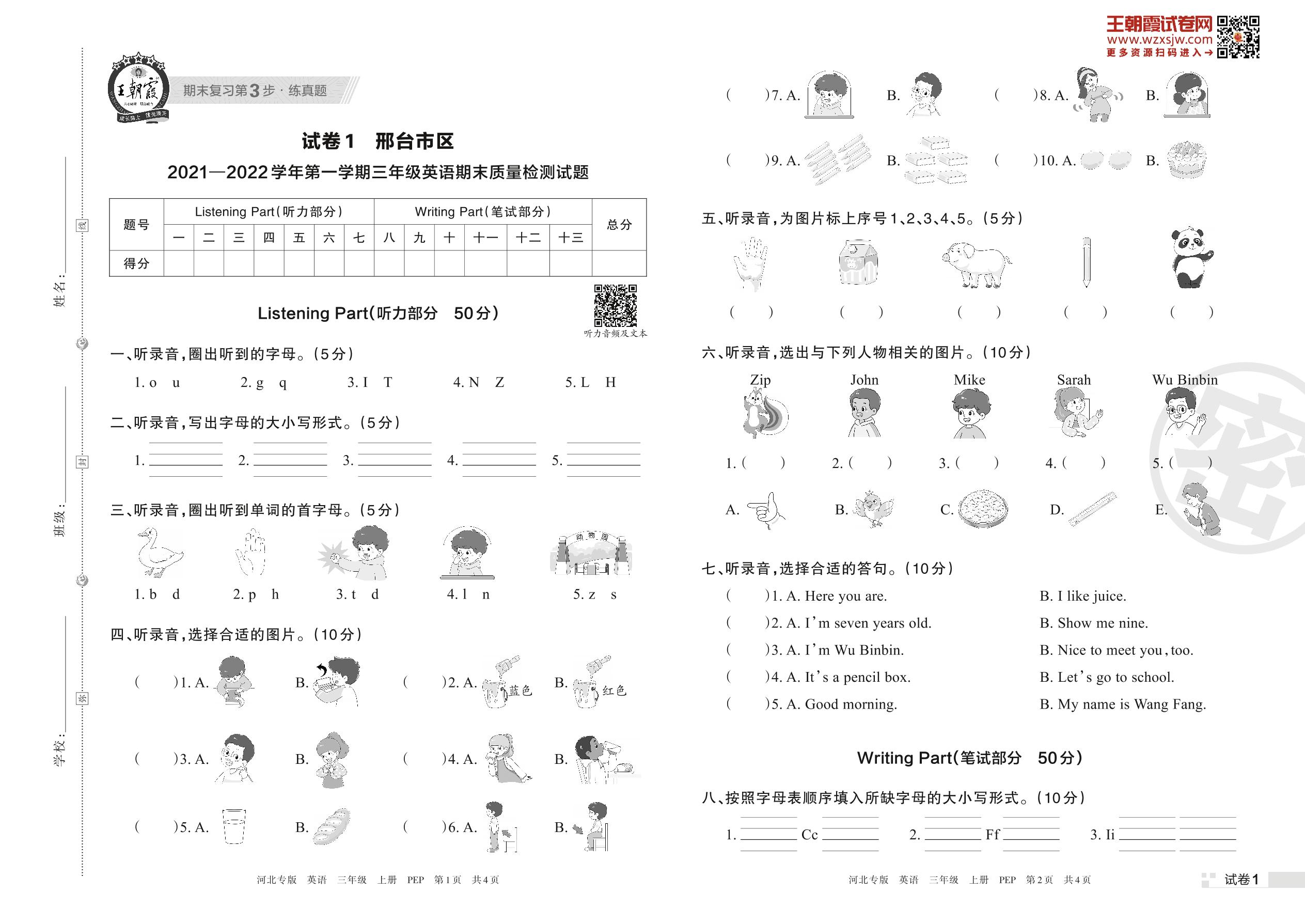 邢台市区2021—2022学年第一学期三年级英语期末质量检测试题(PEP版)【1】