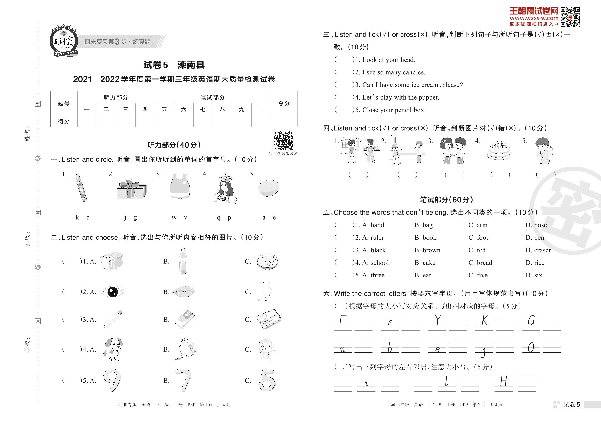 滦南县2021—2022学年度第一学期三年级英语期末质量检测试卷(PEP版)【5】