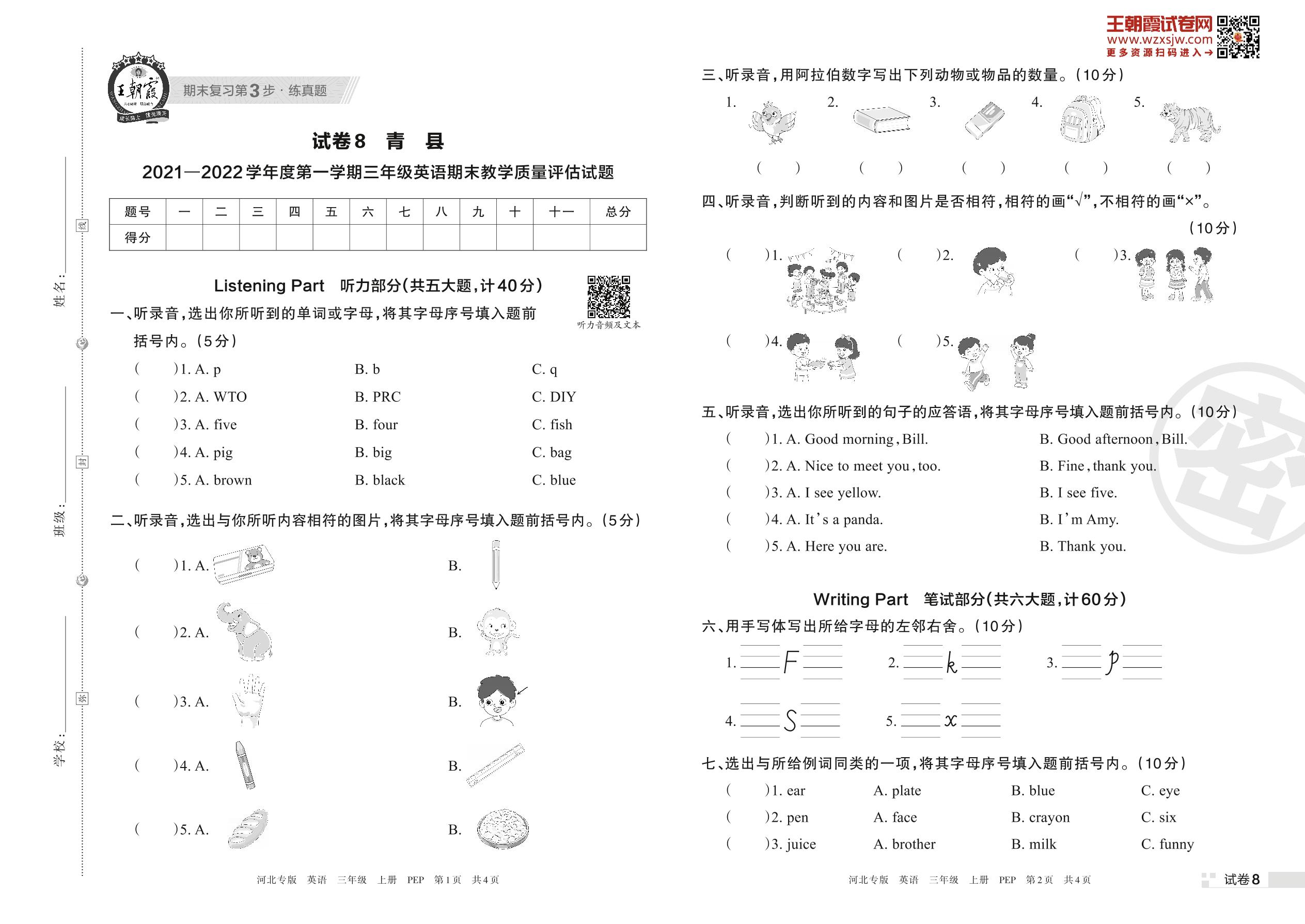 青县2021—2022学年度第一学期三年级英语期末教学质量评估试题(PEP版)【8】
