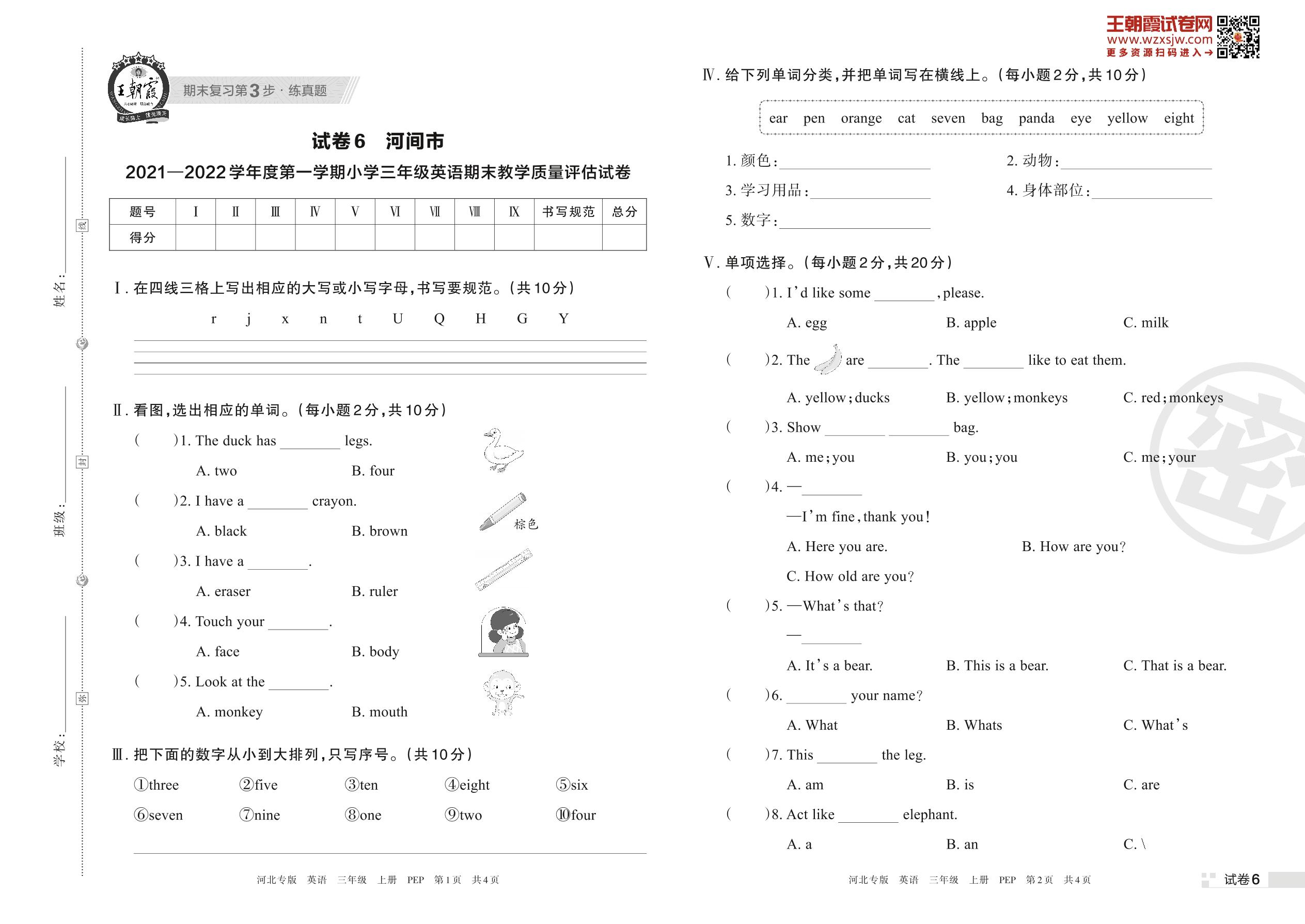 河间市2021—2022学年度第一学期小学三年级英语期末教学质量评估试卷(PEP版)【6】