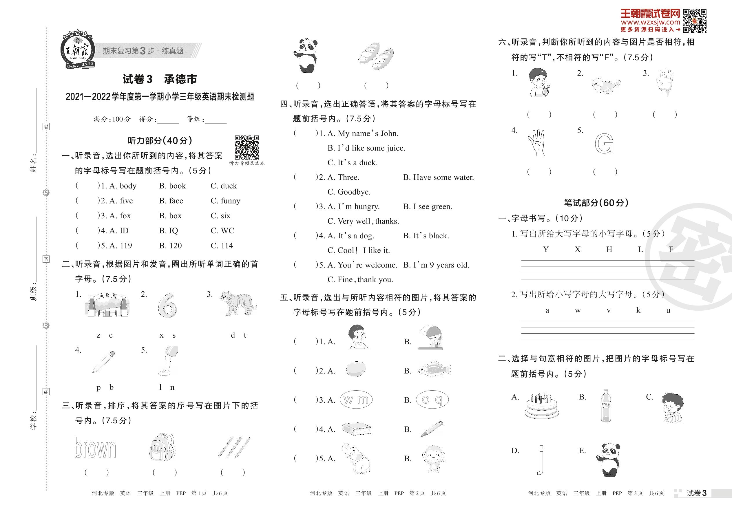 承德市2021—2022学年度第一学期小学三年级英语期末检测题(PEP版)【3】