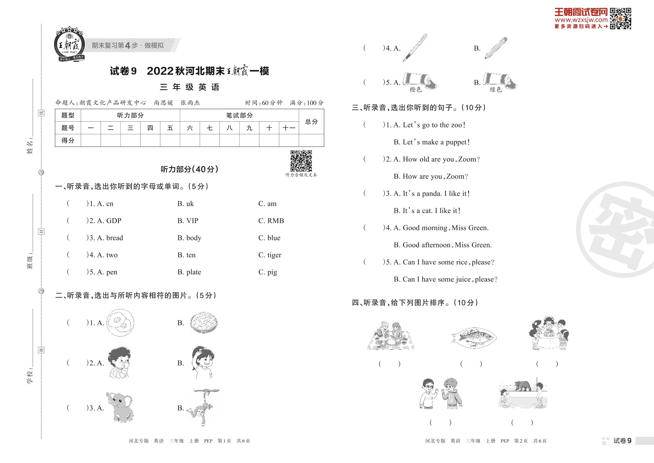 王朝霞期末模拟卷三年级上册英语(PEP版)_R221124111712821【9】