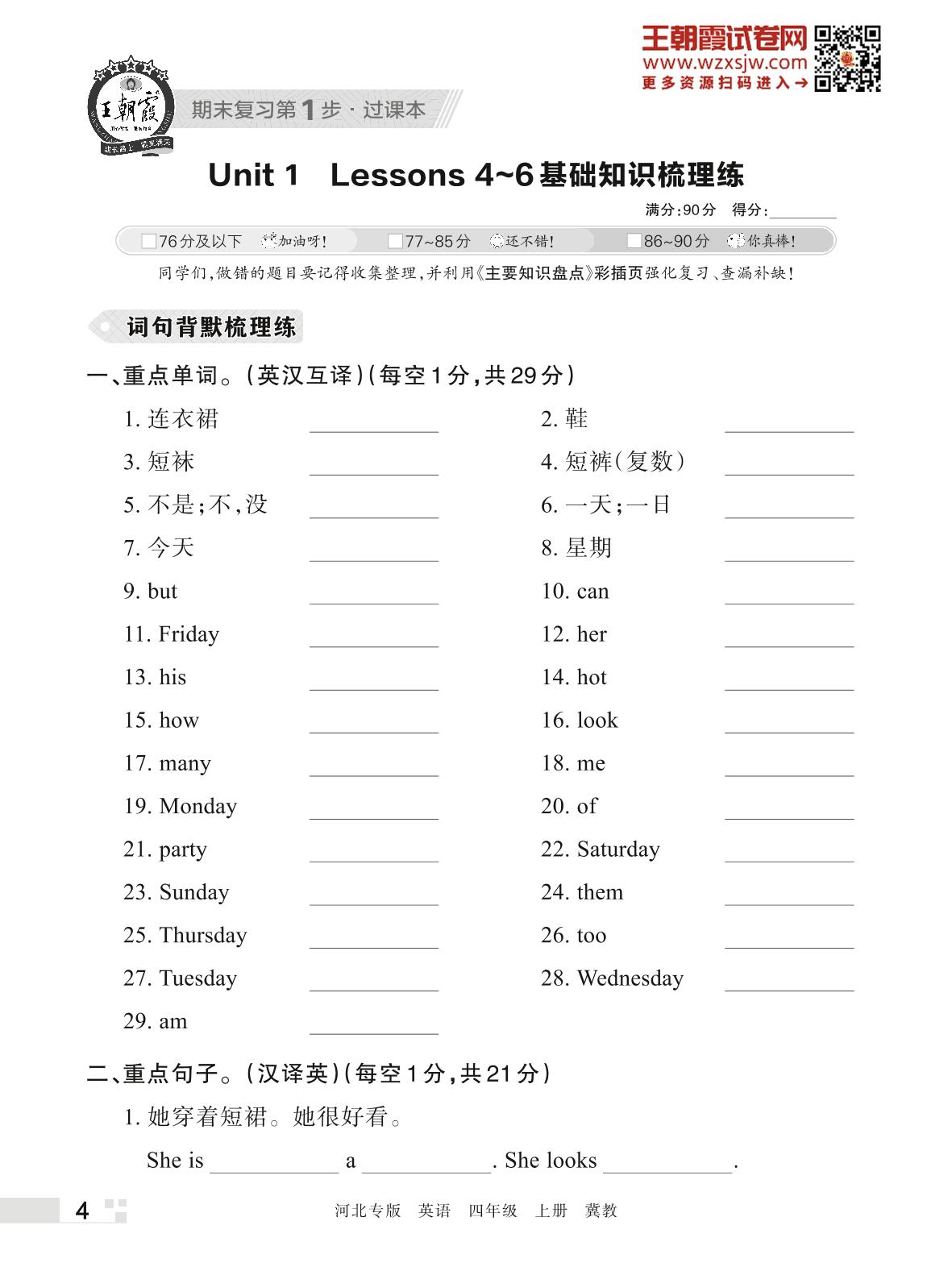 王朝霞期末过课本——Unit 1 Lessons 4~6 基础知识梳理练四年级上册英语(冀教版)