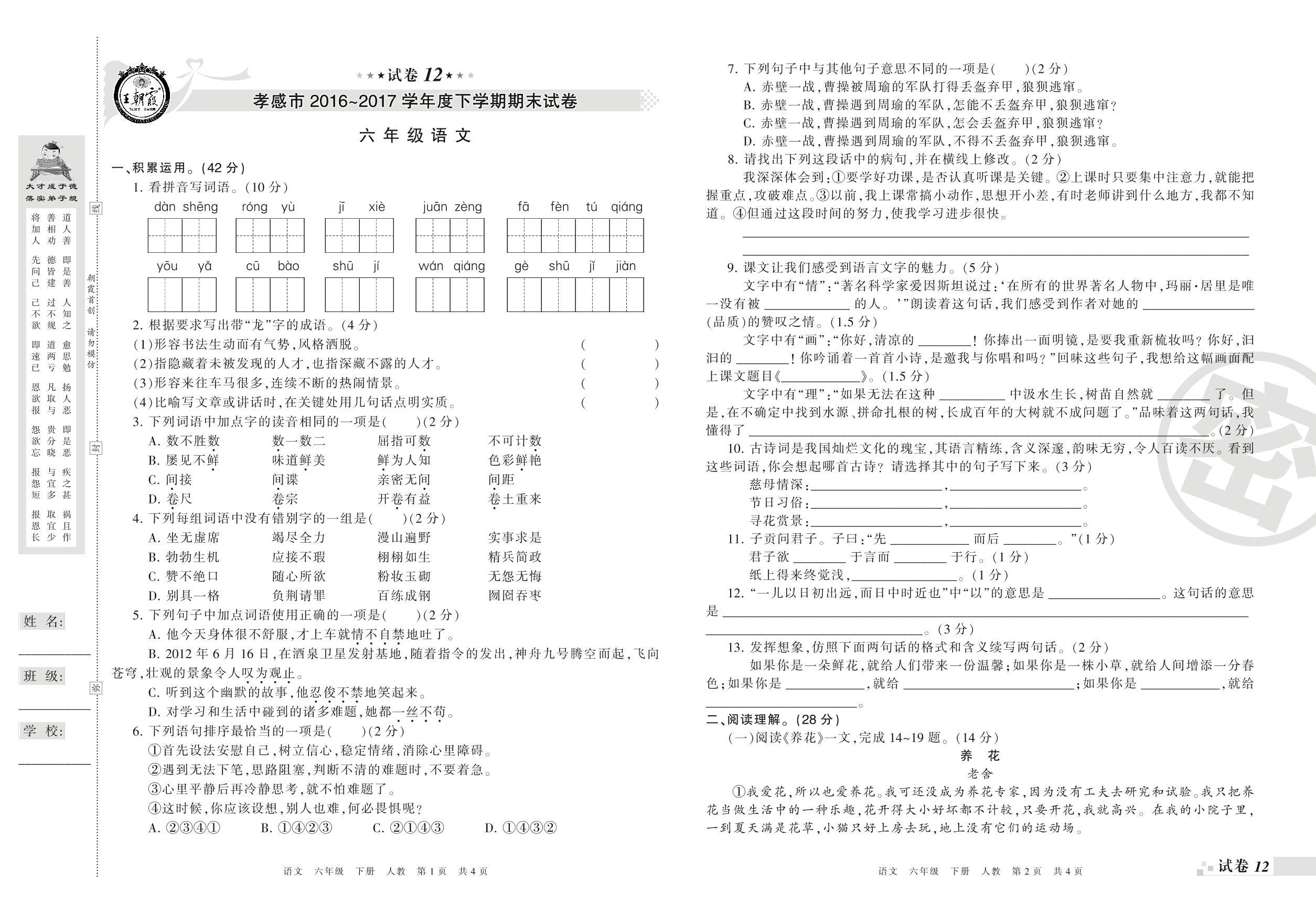 2016-2017学年第二学期孝感市六年级语文试卷(人教版)【12】