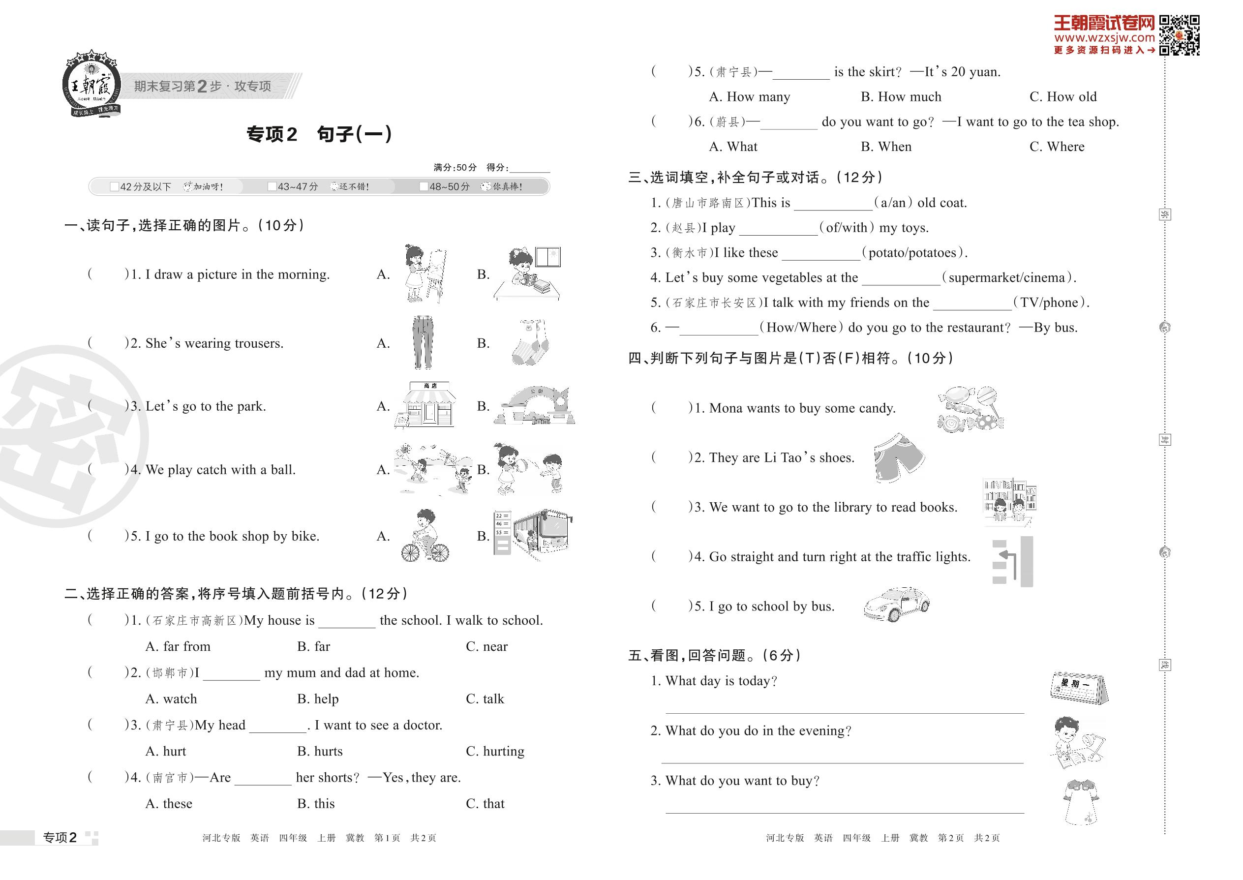 王朝霞期末专项卷——句子(一)四年级上册英语(冀教版)【2】