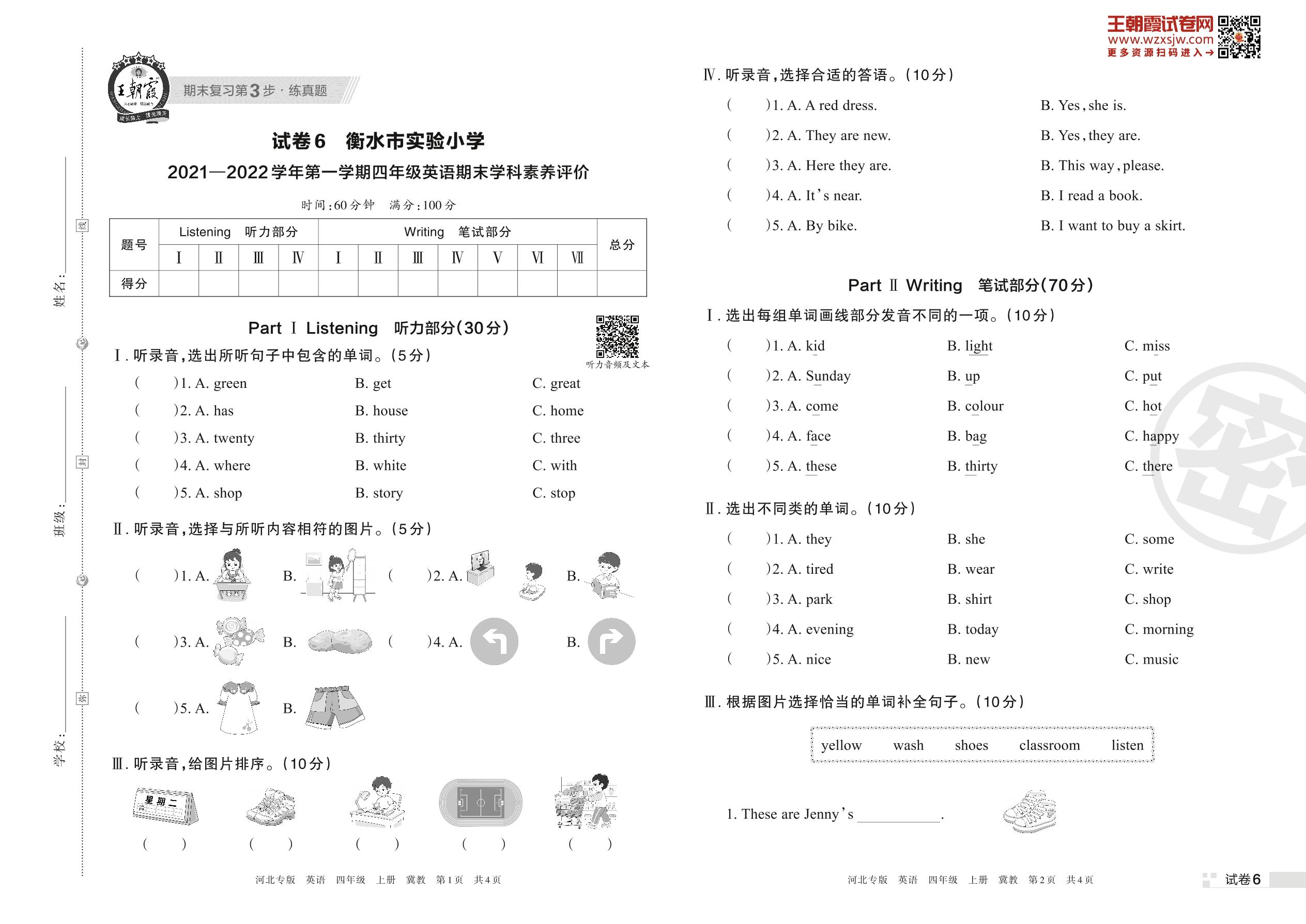 衡水市实验小学2021—2022学年第一学期四年级英语期末学科素养评价(冀教版)【6】