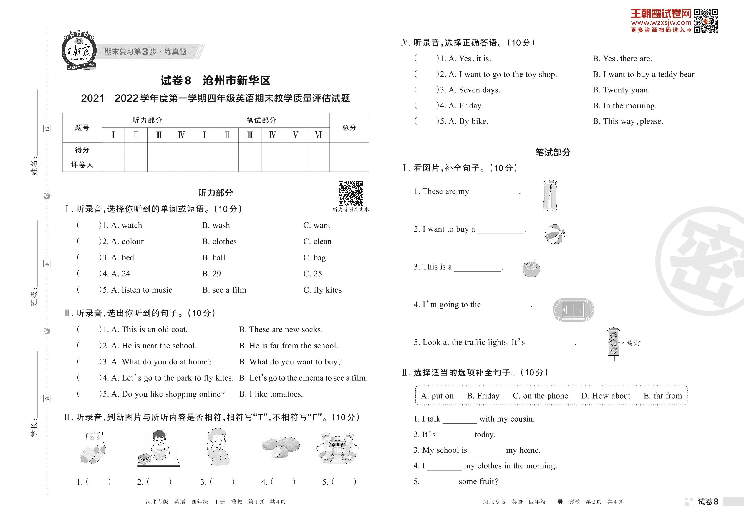 沧州市新华区2021—2022学年度第一学期四年级英语期末教学质量评估试题(冀教版)【8】