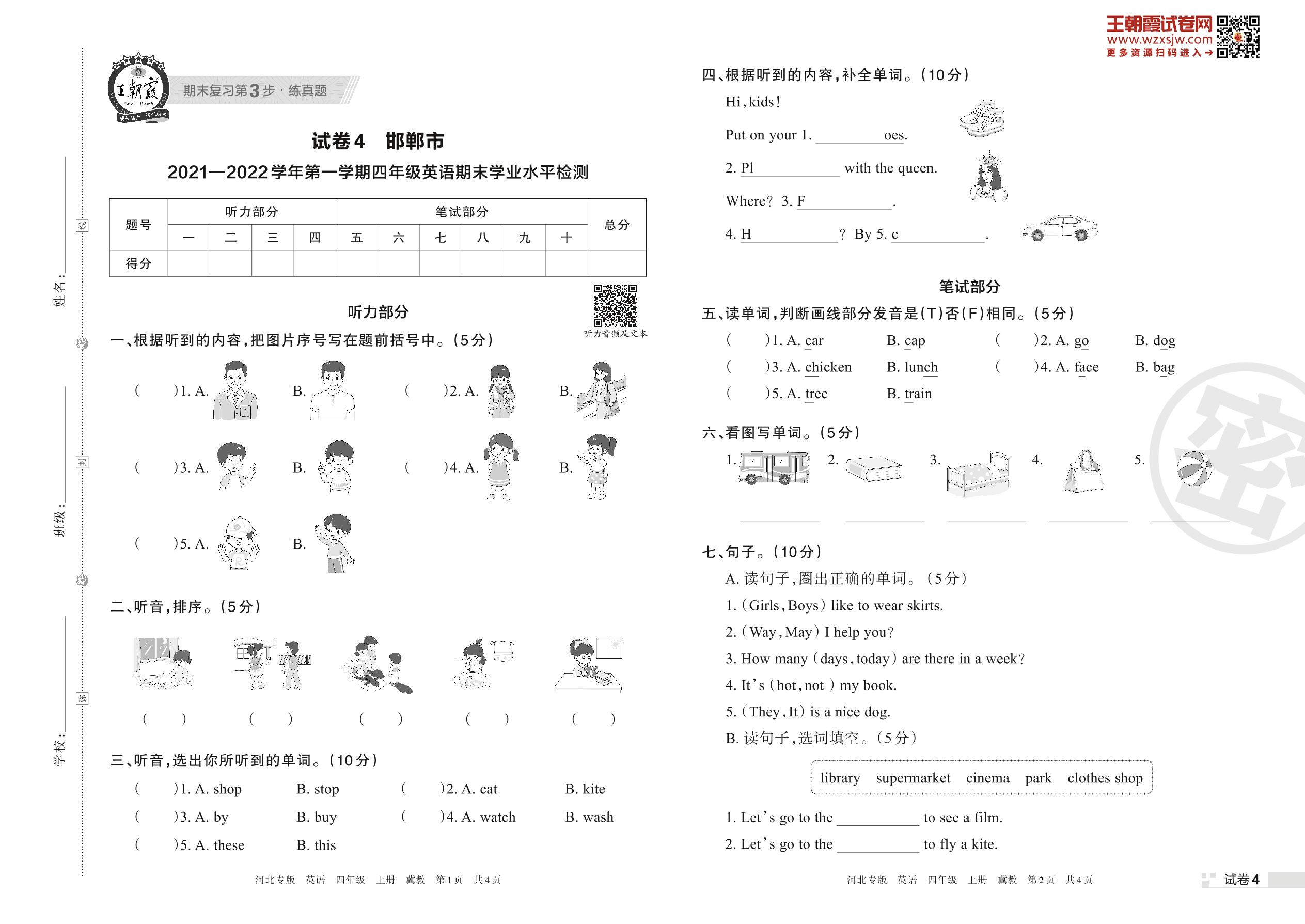邯郸市2021—2022学年第一学期四年级英语期末学业水平检测(冀教版)【4】