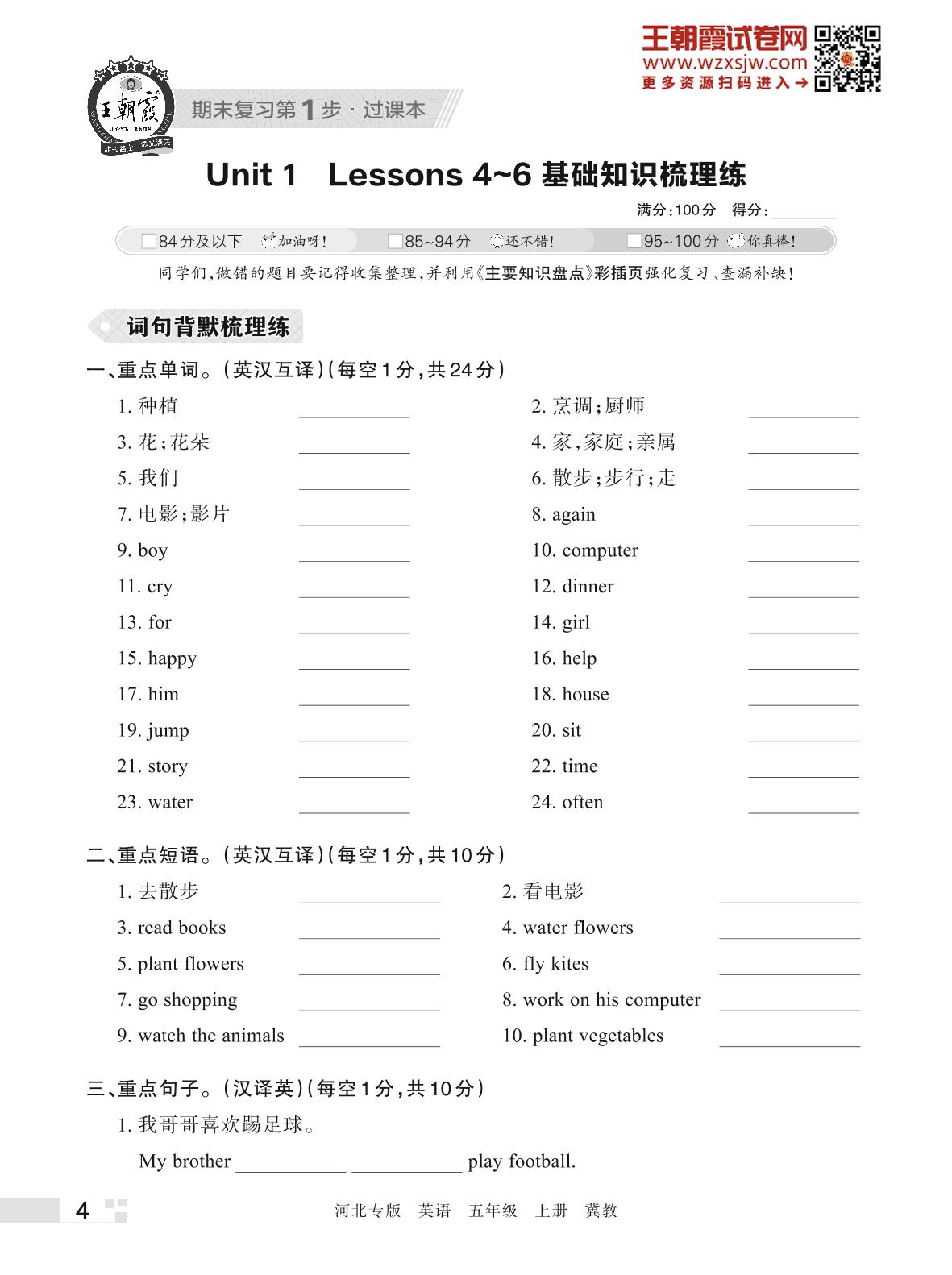 王朝霞期末过课本——Unit 1 Lessons 4~6 基础知识梳理练五年级上册英语(冀教版)