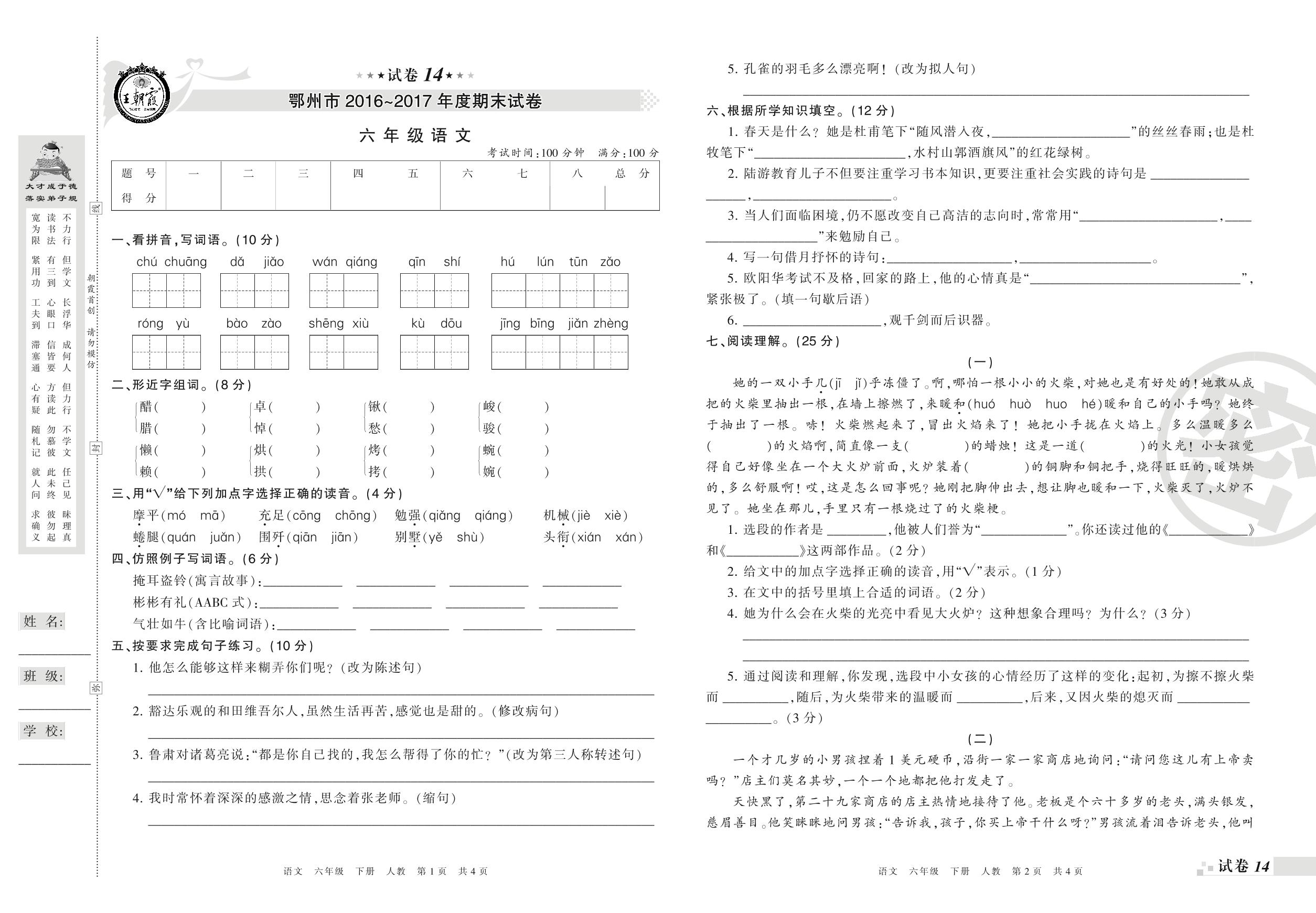 2016-2017学年第二学期鄂州市六年级语文试卷(人教版)【14】