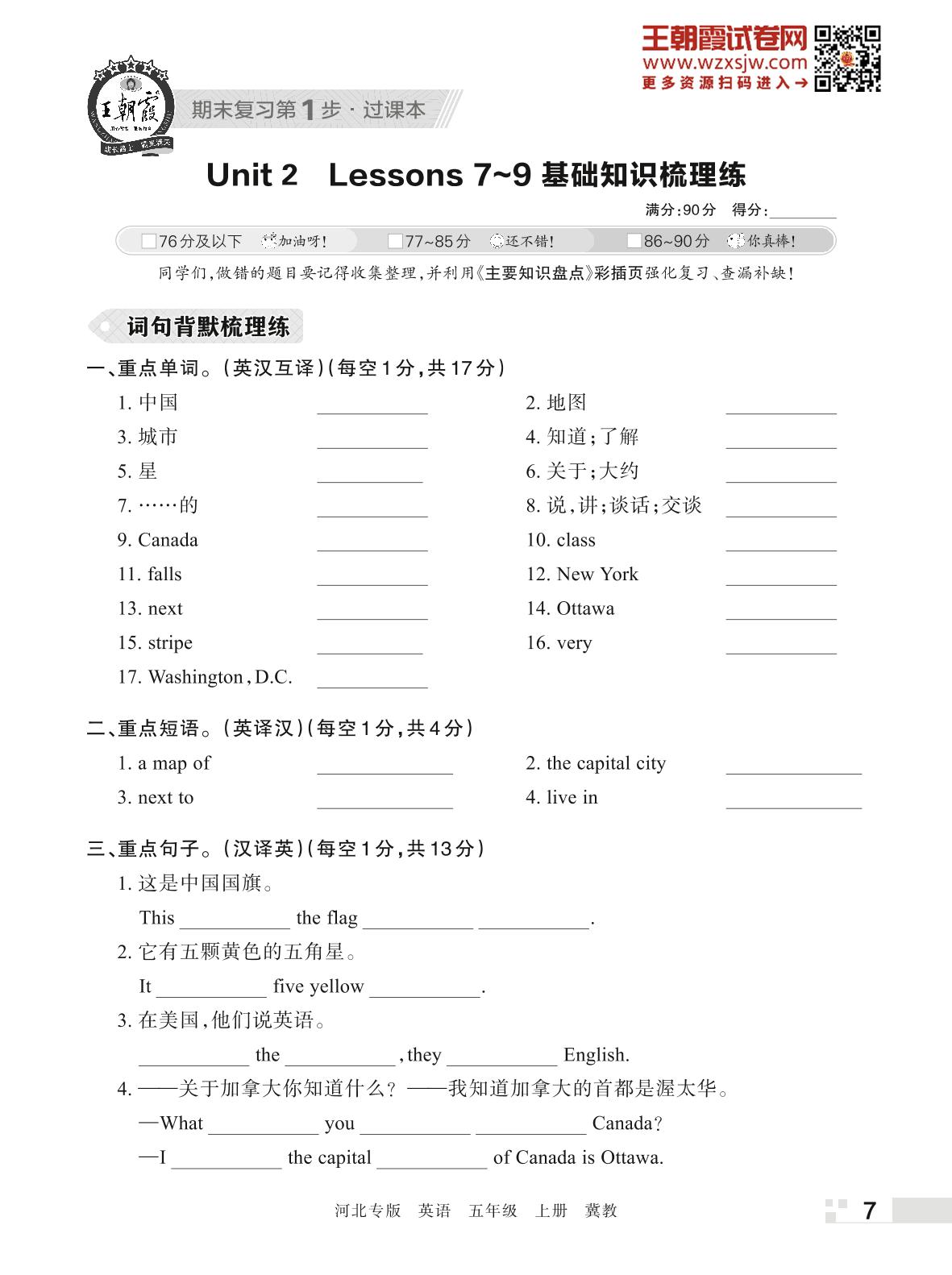 王朝霞期末过课本——Unit 2 Lessons 7~9 基础知识梳理练五年级上册英语(冀教版)