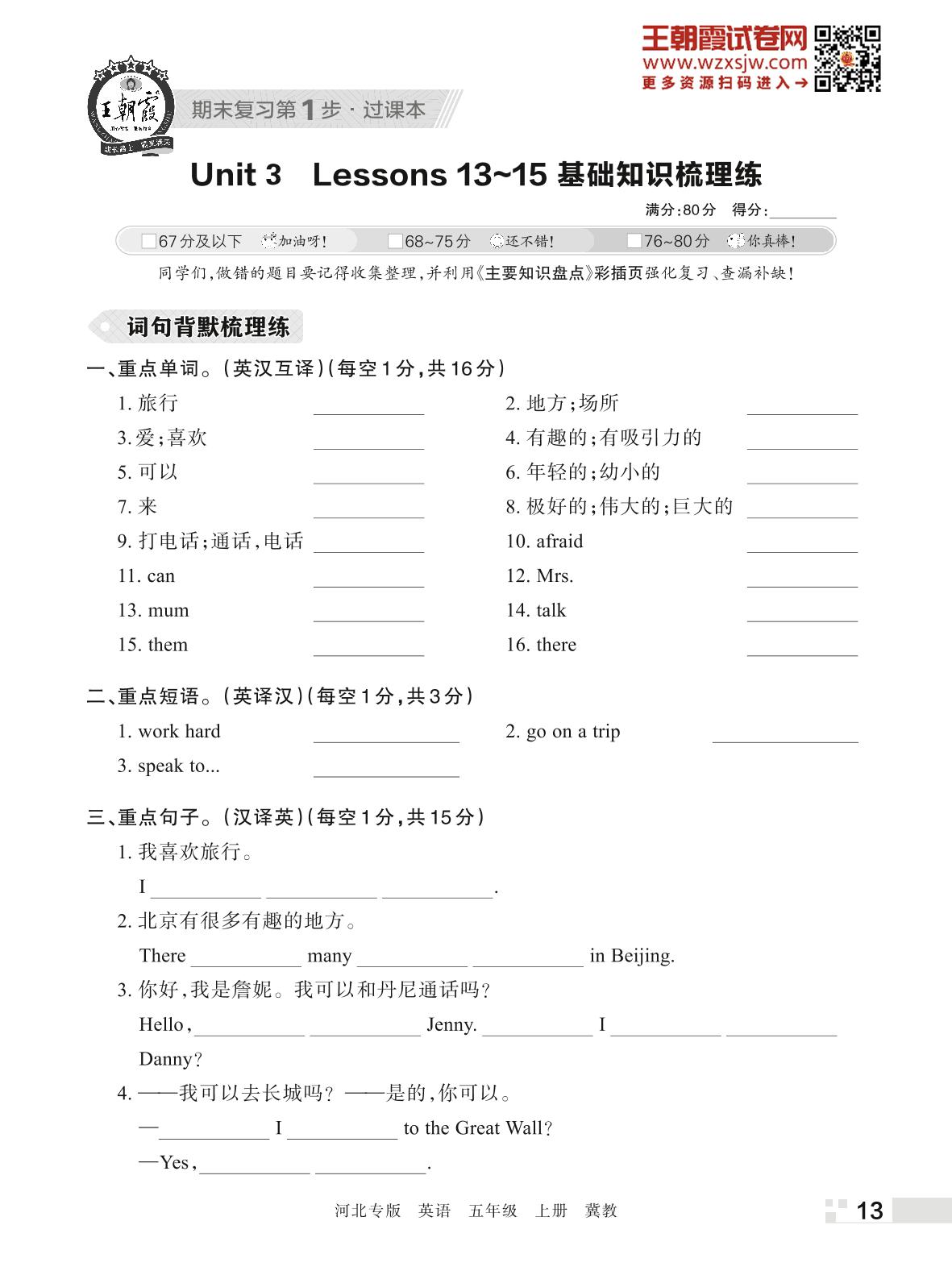 王朝霞期末过课本——Unit 3 Lessons 13~15 基础知识梳理练五年级上册英语(冀教版)