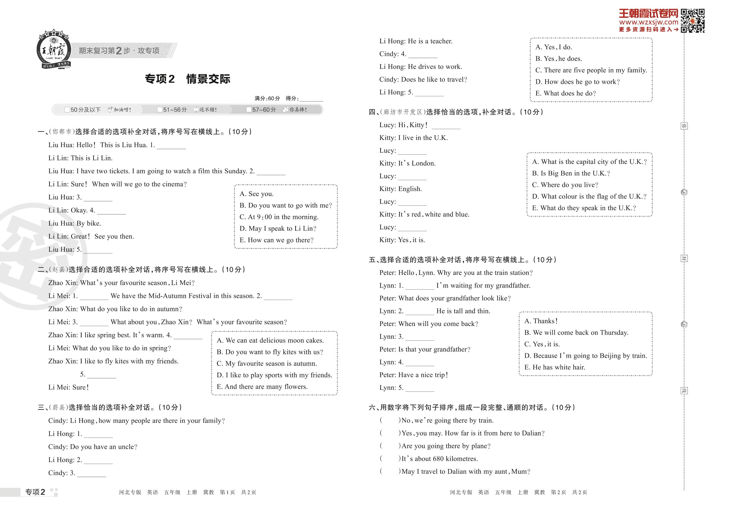 王朝霞期末专项卷——情景交际五年级上册英语(冀教版)【2】