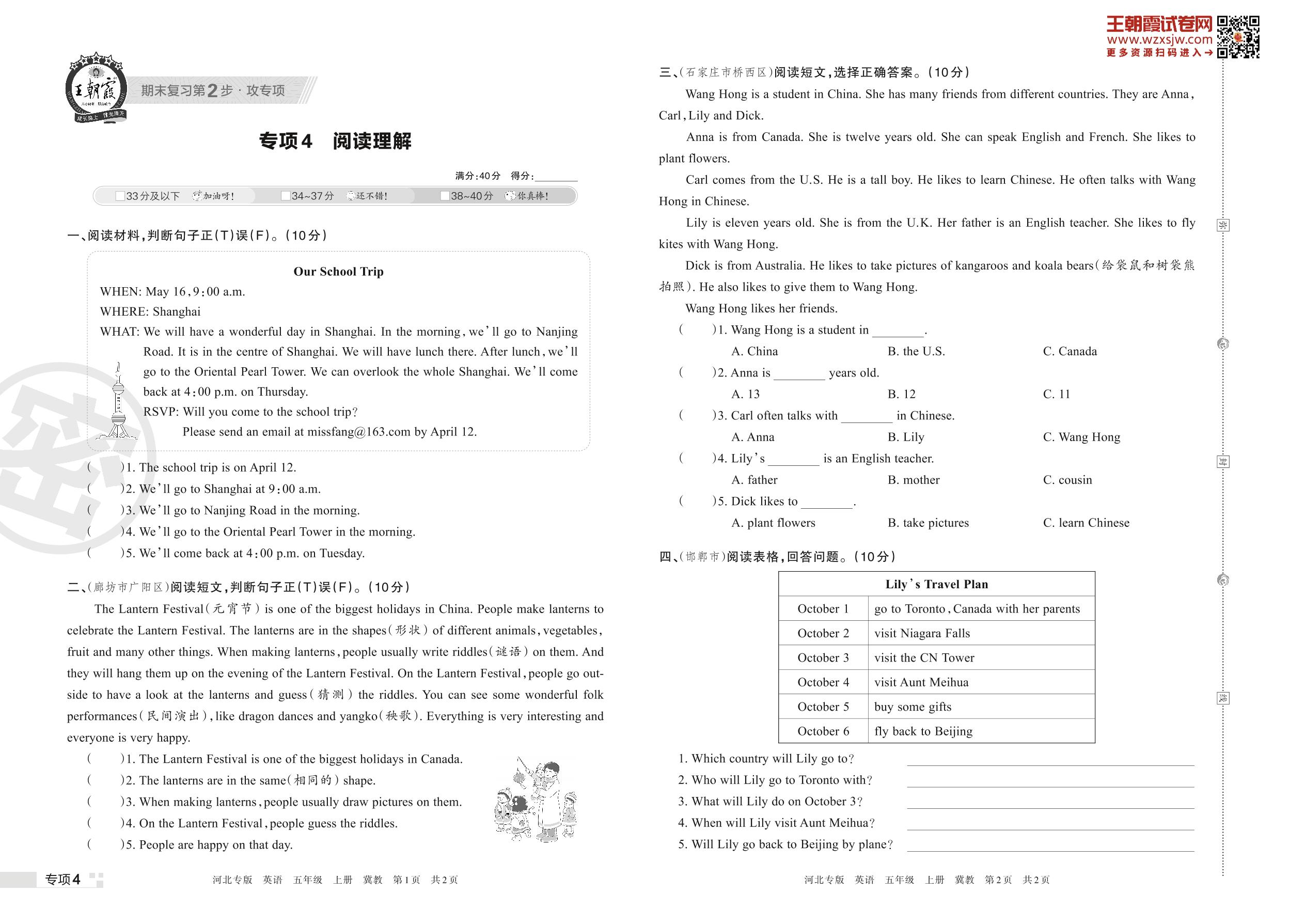 王朝霞期末专项卷——阅读理解五年级上册英语(冀教版)【4】