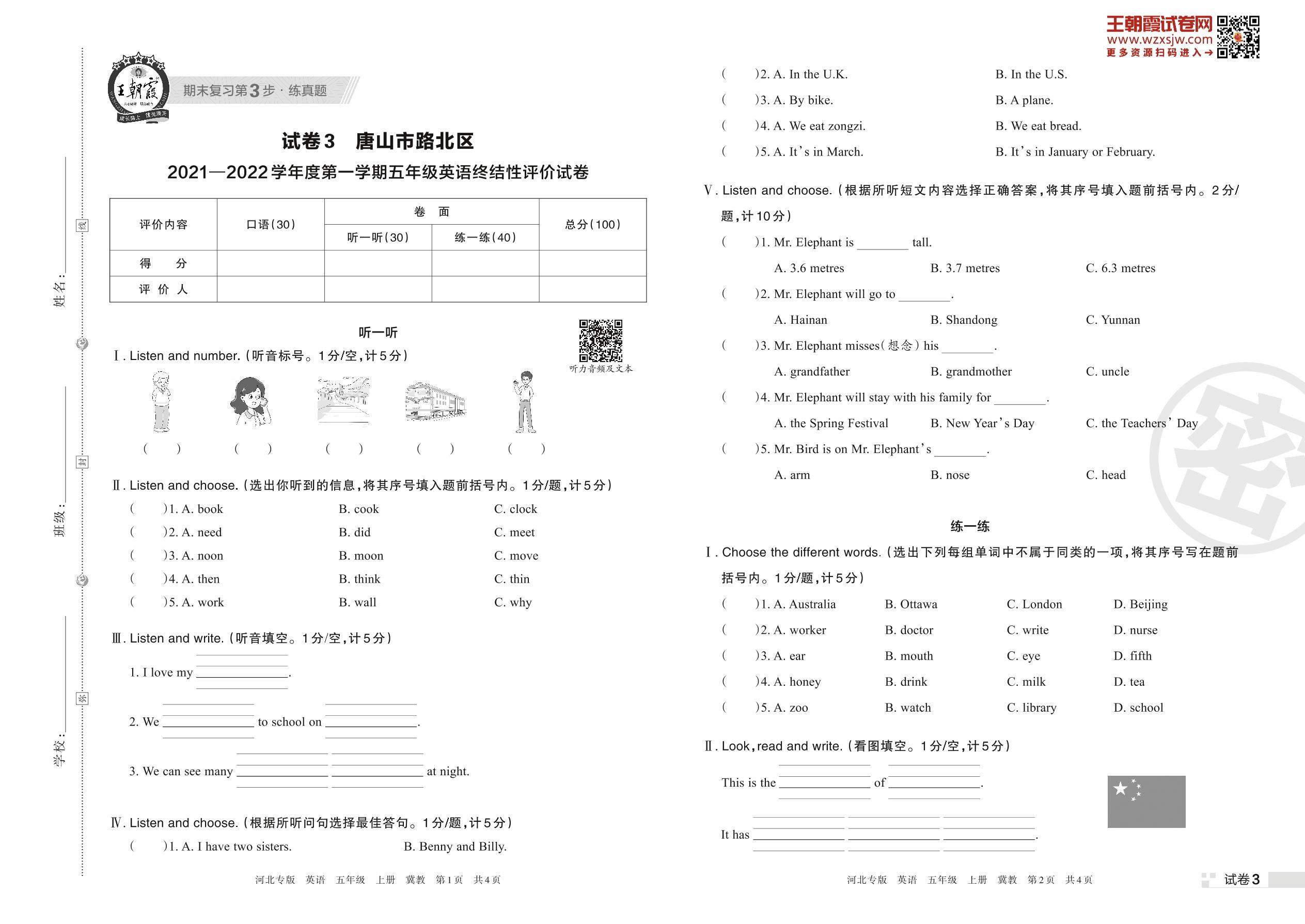 唐山市路北区2021—2022学年度第一学期五年级英语终结性评价试卷(冀教版)【3】
