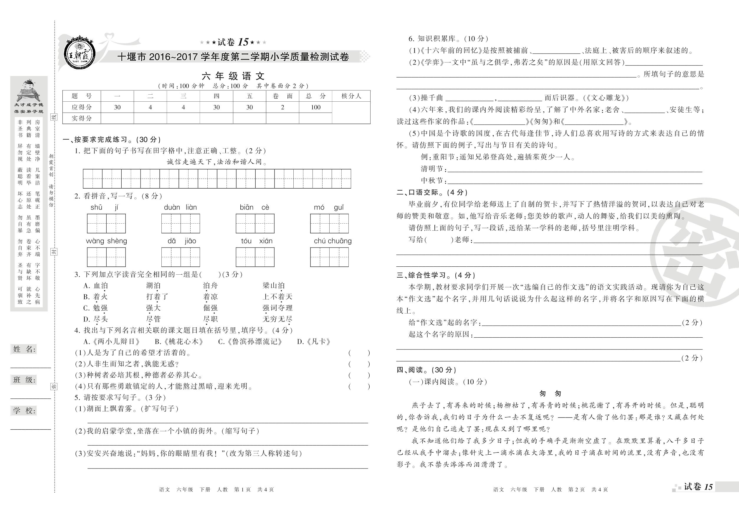2016-2017学年第二学期十堰市六年级语文试卷(人教版)【15】