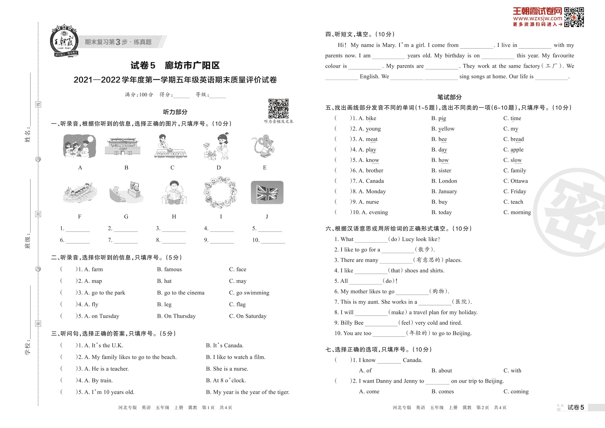 廊坊市广阳区2021—2022学年度第一学期五年级英语期末质量评价试卷(冀教版)【5】